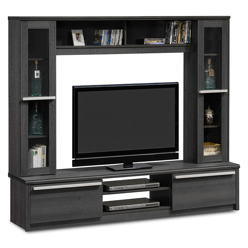 * Το κάτω μέρος της σύνθεσης φέρει δύο ντουλαπάκια και ράφια για την αποθήκευση των ηλεκτρονικών συσκευών. Δεξιά και αριστερά υπάρχει βιτρίνα με κρύσταλλο ενώ την σύνθεση δένει μία οριζόντια ραφιέρα για την προβολή των αγαπημένων σας αντικειμένων.