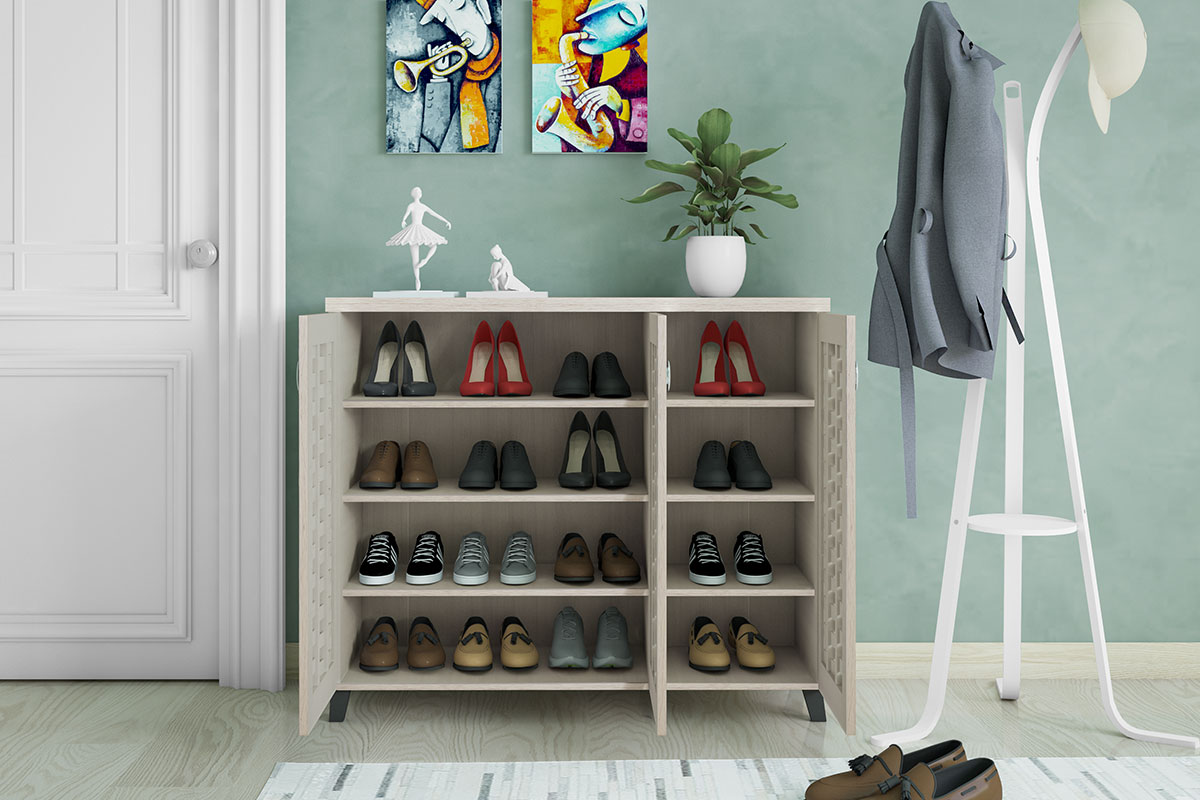 * Περιλαμβάνει δύο πόρτες σε σχέδιο-μοτίβο πλέγματος, εσωτερικά φέρει έξι ράφια για 16 ζεύγη παπουτσιών, ρούχα ή αξεσουάρ.
