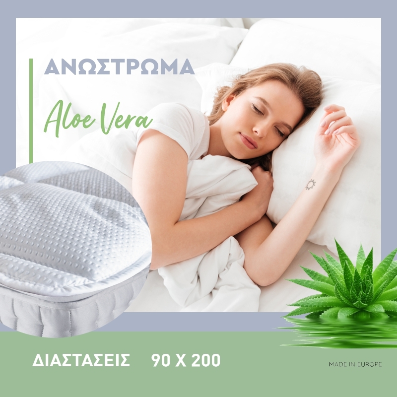 Πλεκτό ζακάρ με επεξεργασία Aloe Vera και τεχνολογία 3D Air Mesh, που ενισχύει τον αερισμό του ανωστρώματος και διατηρεί σταθερή θερμοκρασία κατά τη διάρκεια της νύχτας. Η αλόη βέρα, γνωστή για τις καταπραϋντικές της ιδιότητες, προσφέρει φυσική φροντίδα και αίσθηση φρεσκάδας.