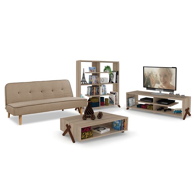 Το σετ 4τμχ περιέχει έναν καναπέ - κρεβάτι, ένα τραπέζι σαλονιού, ένα έπιπλο τηλεόρασης και μία βιβλιοθήκη.