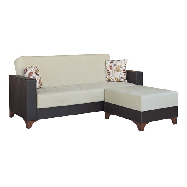 Καναπές γωνία, που μετατρέπετε σε κρεβάτι, κατασκευασμένος από ξύλινο σκελετό, με επένδυση από καφέ pu και μπεζ ύφασμα σε μοντέρνο σχεδιασμό.