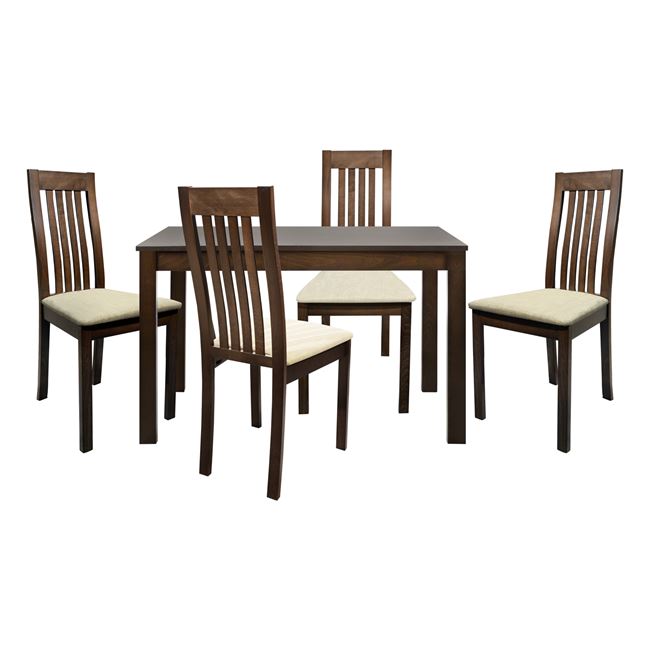 4 Καρέκλες κουζίνας ξύλινη σε σκούρο καρυδί χρώμα και με εκρού ύφασμα στο κάθισμα. Η καρέκλα διατίθεται σε πακέτο ασυναρμολόγητη.