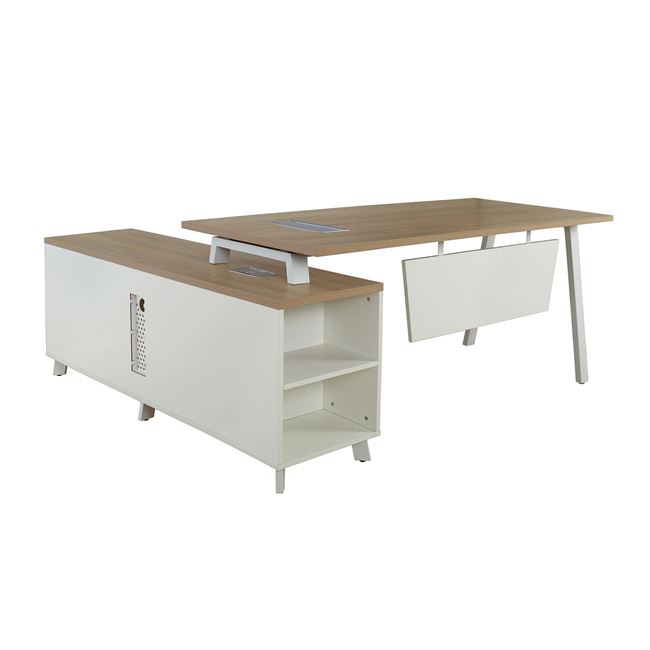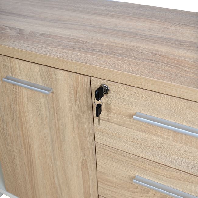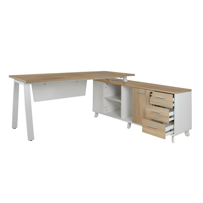 Μοντέρνο γραφείο γωνία με συρταριέρα και ένα ντουλάπι από την νέα σειρά επαγγελματικών προδιαγραφών "STATUS" με sonama επιφανεία και λευκό μεταλλικό σκελετό.
