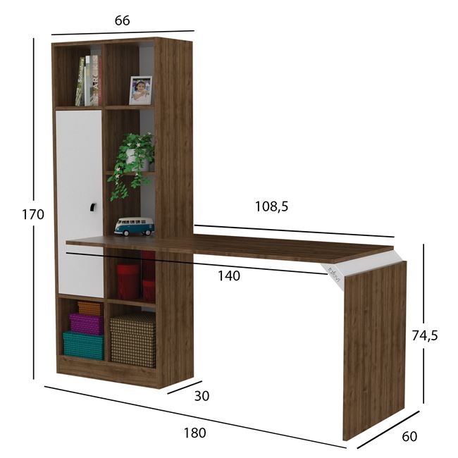 Μοντέρνος σχεδιασμός, ανθεκτικά υλικά, διαθέτει 7 ράφια ως χώρο αποθήκευσης, ένα ντουλάπι και μια μεγάλη επιφάνεια γραφείου.