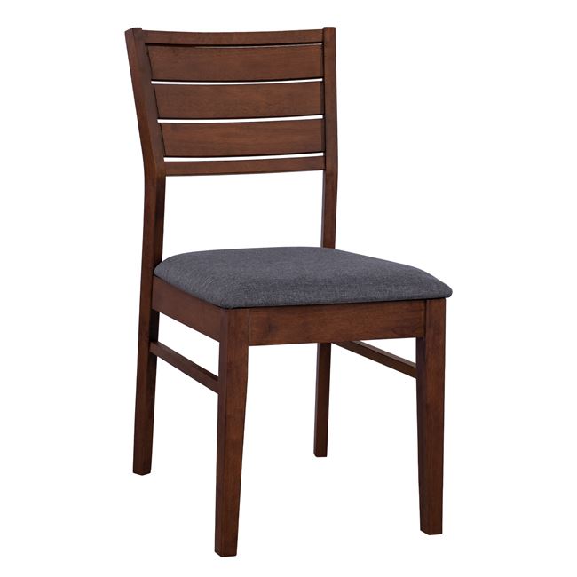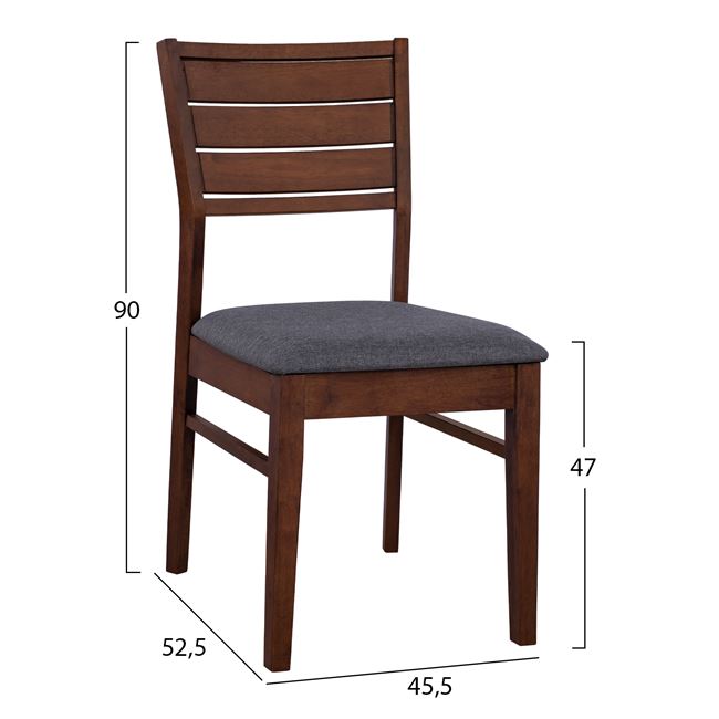 Η καρέκλα LEDA είναι κατασκευασμένη από ξύλινο σκελετό σε καρυδί απόχρωση και το κάθισμα της είναι από ύφασμα σε σκούρο γκρι χρώμα.