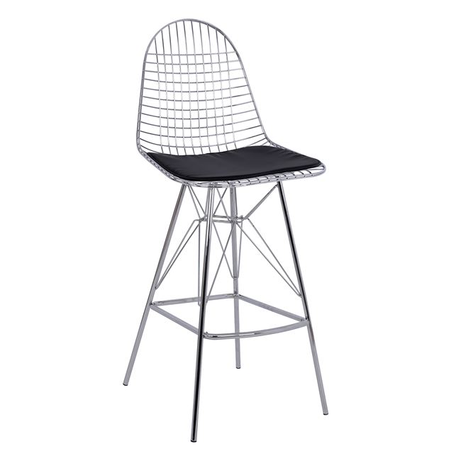 Το σκαμπό είναι κατασκευασμένο από μέταλλο σε χρωμίου απόχρωση, και διαθέτει μαξιλαράκι από τεχνόδερμα σε μαύρο χρώμα.