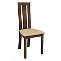Καρέκλα τραπεζαρίας από μασίφ σκελετό σε καρυδί χρώμα.Η πλάτη της καρέκλας διαθέτει ένα επιπλέον τμήμα από ξύλο και κάθισμα με υφασμάτινη επένδυση σε μπεζ χρώμα.