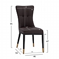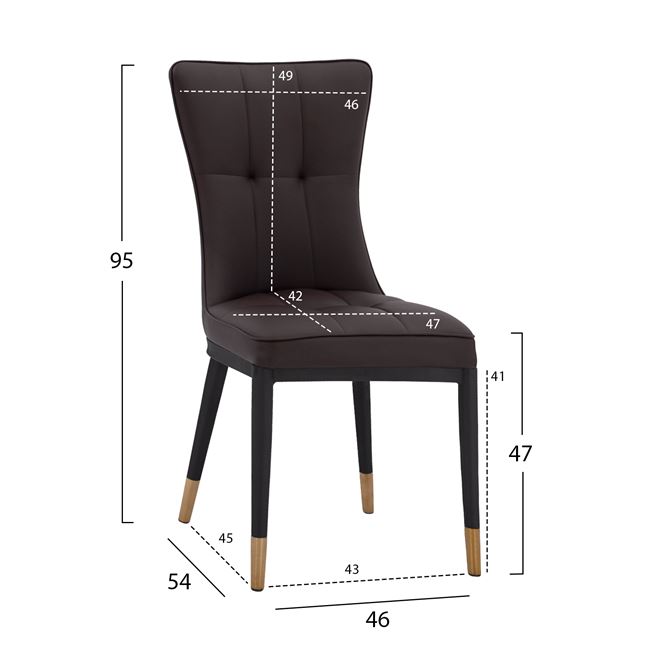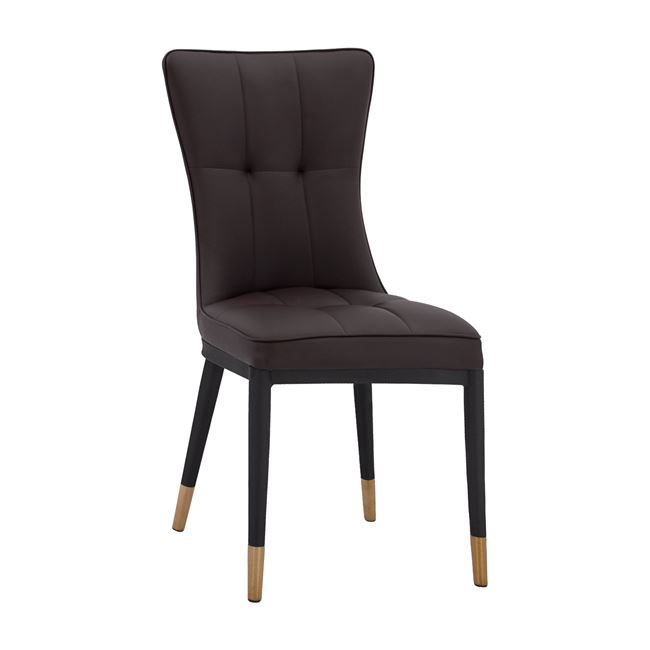 Η καρέκλα FB98722.12 είναι επενδυμένη με τεχνόδερμα σε καφέ απόχρωση, με μεταλλικό μαύρο σκελετό και χρυσές λεπτομέρειες.