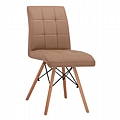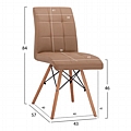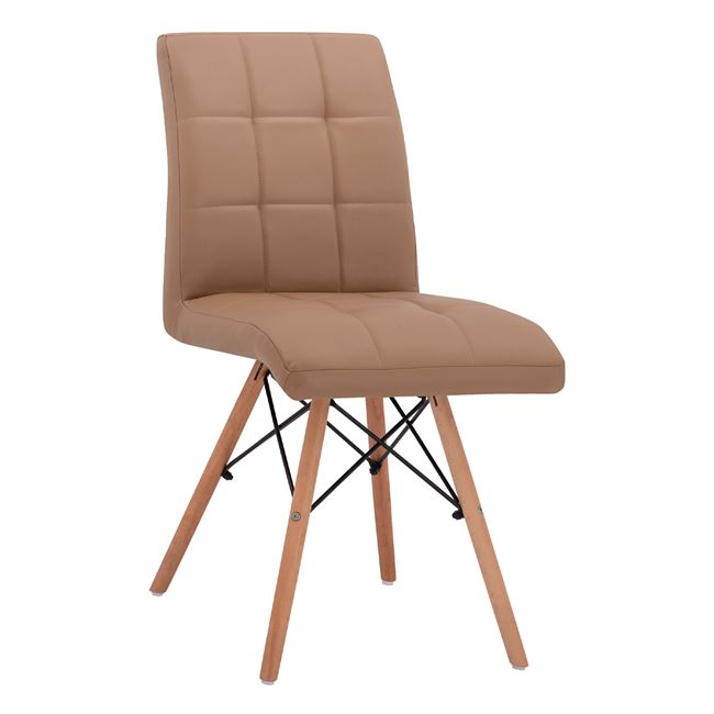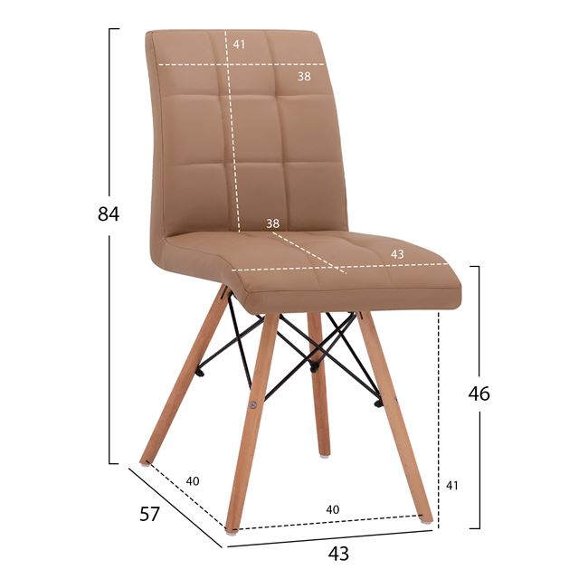 Η καρέκλα είναι επενδυμένη με τεχνόδερμα σε καπουτσίνο απόχρωση, ενώ τα πόδια της, είναι από φυσικό μασίφ ξύλο οξιάς και μέταλλο σε μαύρη απόχρωση.