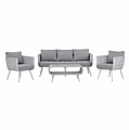 Το FB95282.12 είναι ένα όμορφο σετ σαλονιού εξωτερικού χώρου με τραπεζάκι, 2 πολυθρόνες και 1 τριθέσιο καναπέ. Τα πόδια είναι αλουμινίου σε ΛΕΥΚΟ ενώ η επένδυση έχει γίνει με συνθετικό σχοινί strap σε ΑΝΟΙΧΤΟ ΓΚΡΙ χρώμα. Το design τους είναι πανέμορφο στην όψη ενώ η στιβαρότητά τους είναι εμφανής. Τα αναπαυτικά μαξιλάρια τόσο στο κάθισμα όσο και στην πλάτη διαθέτουν ανθεκτικά πολυεστερικά καλύμματα με φερμουάρ για εύκολη αφαίρεση και πλύσιμο. Το τραπεζάκι είναι ίδιας αισθητικής και διαθέτει επιφάνεια από γυαλί ασφαλείας. Ιδανικό τόσο για το σπίτι, όσο και για επαγγελματικούς χώρους.