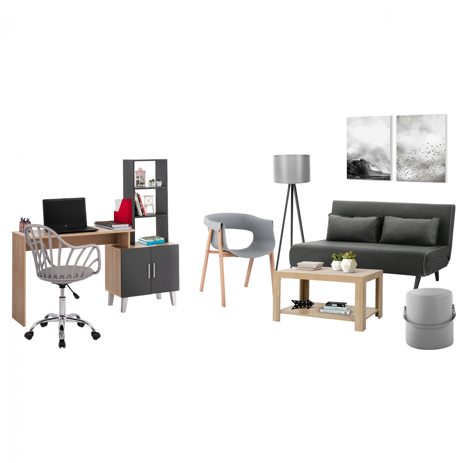 Σετ 8 τμχ περιέχει καναπέ κρεβάτι, τραπεζάκι σαλονιού, πολυθρόνα, γραφείο με βιβλιοθήκη, καρέκλα γραφείου, σκαμπό, φωτιστικό δαπέδου & πίνακες.