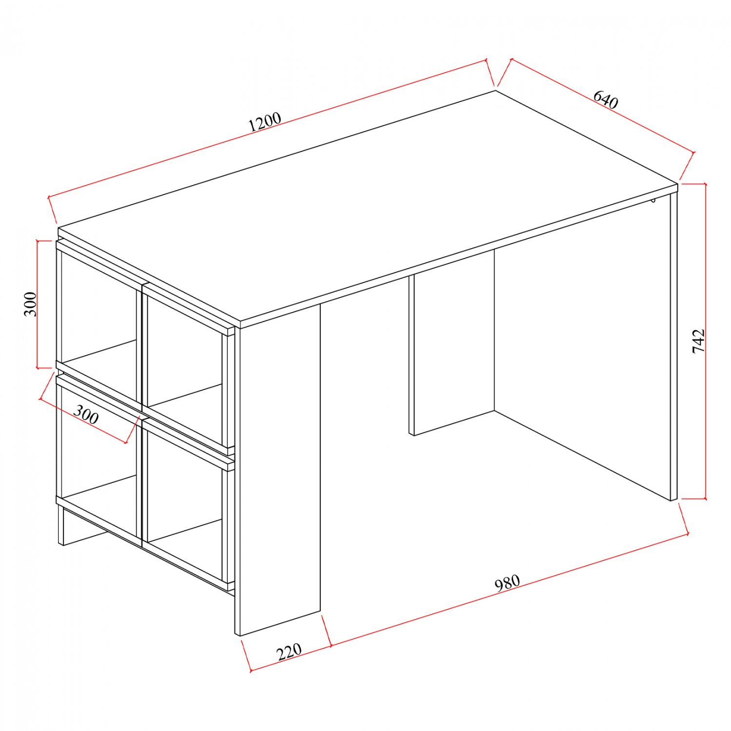 Πέρα από την κύρια επιφάνεια εργασίας, προσφέρει πλαϊνό ράφι στο πόδι, που δημιουργεί δύο χώρους αποθήκευσης, που τους χωρίζει ένα ράφι και με 4 κουτιά αποθήκευσης για την αποθήκευση βιβλίων, εγγράφων και χρηστικών αντικειμένων.
