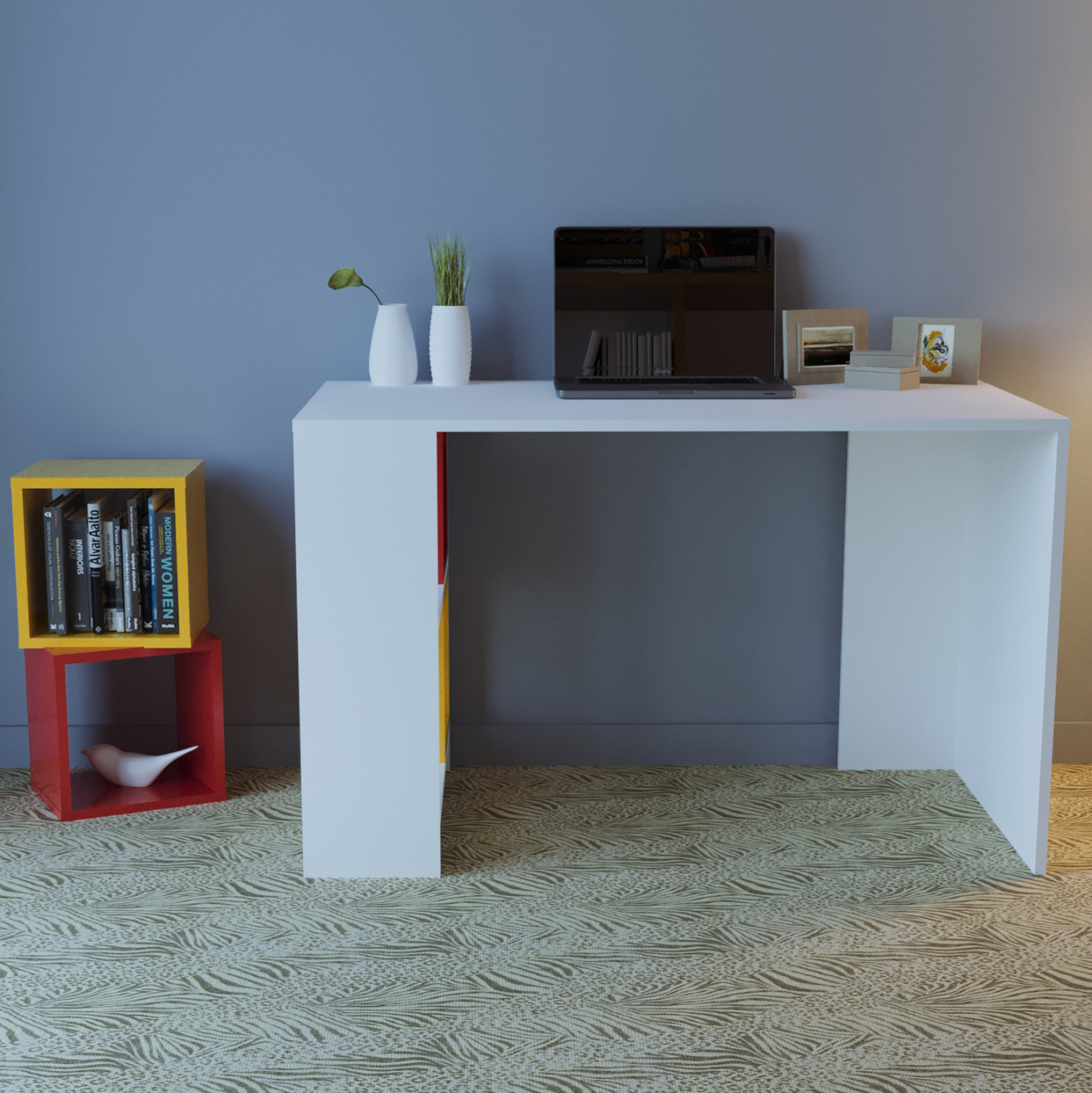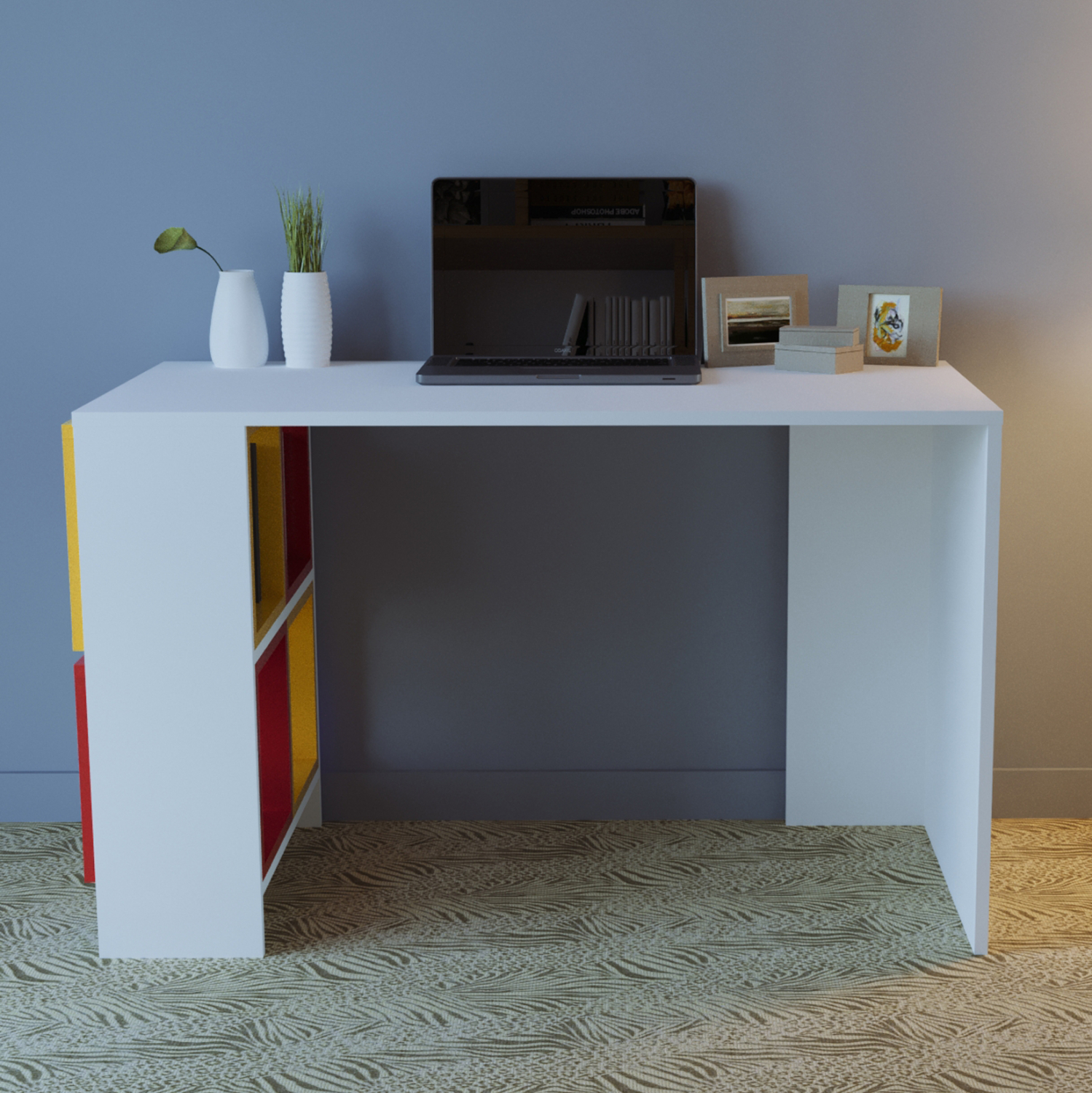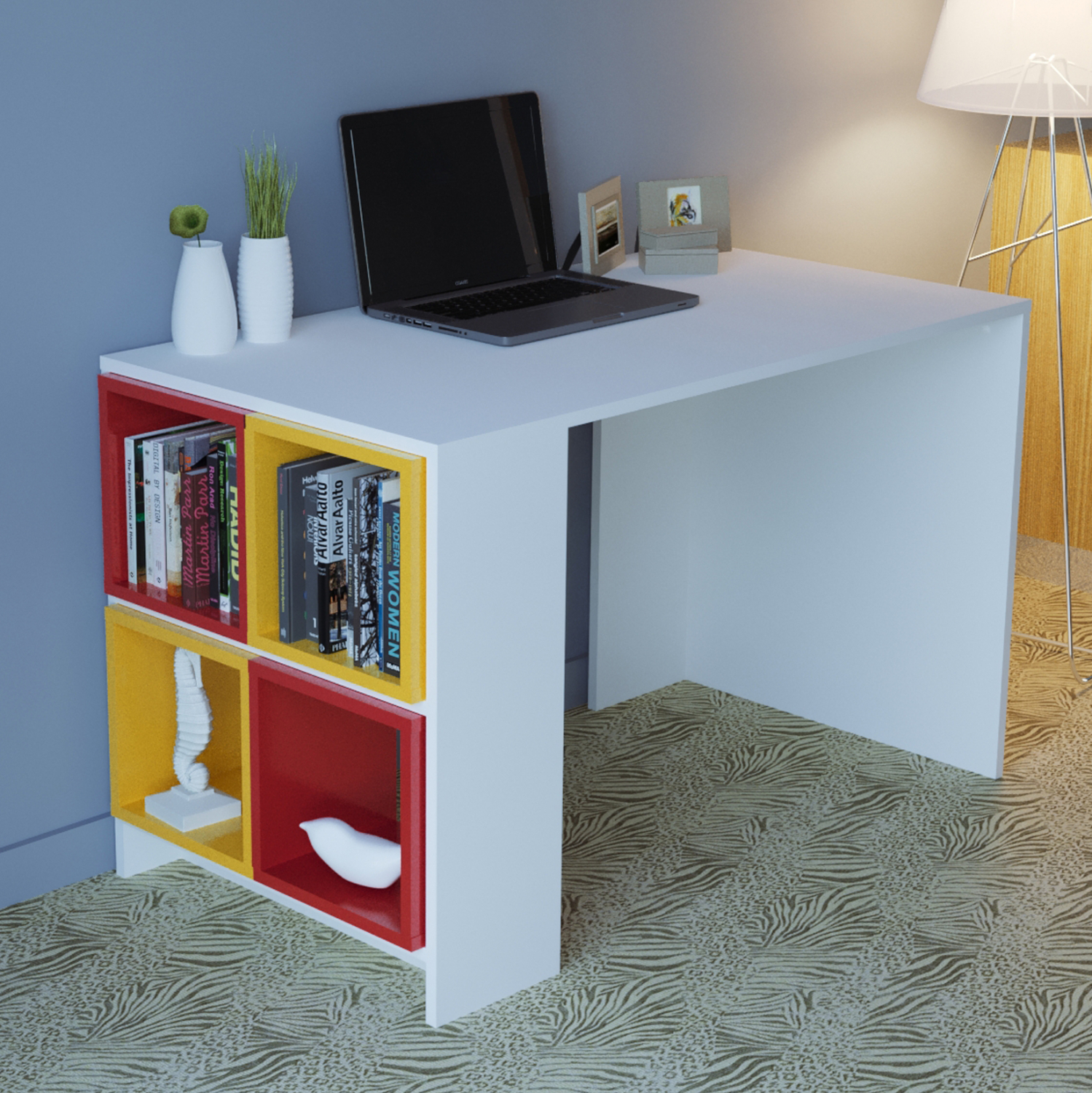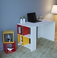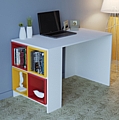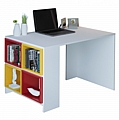 Γραφείο με ραφιέρα, λευκό με κόκκινα και κίτρινα κουτιά.