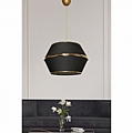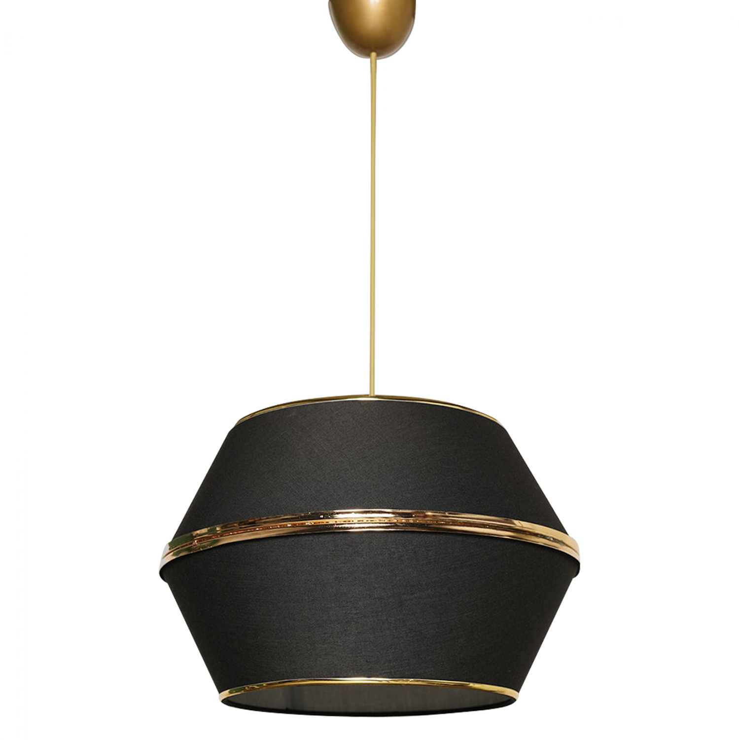 Μοντέρνο κρεμαστό φωτιστικό οροφής, κατασκευασμένο από μεταλλικό σκελετό και επενδυμένο από ύφασμα σε μαύρη απόχρωση με χρυσές λεπτομέρειες στο τελείωμα και τη μέση του καπέλου.