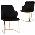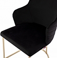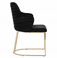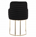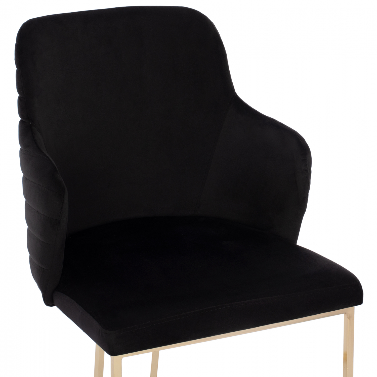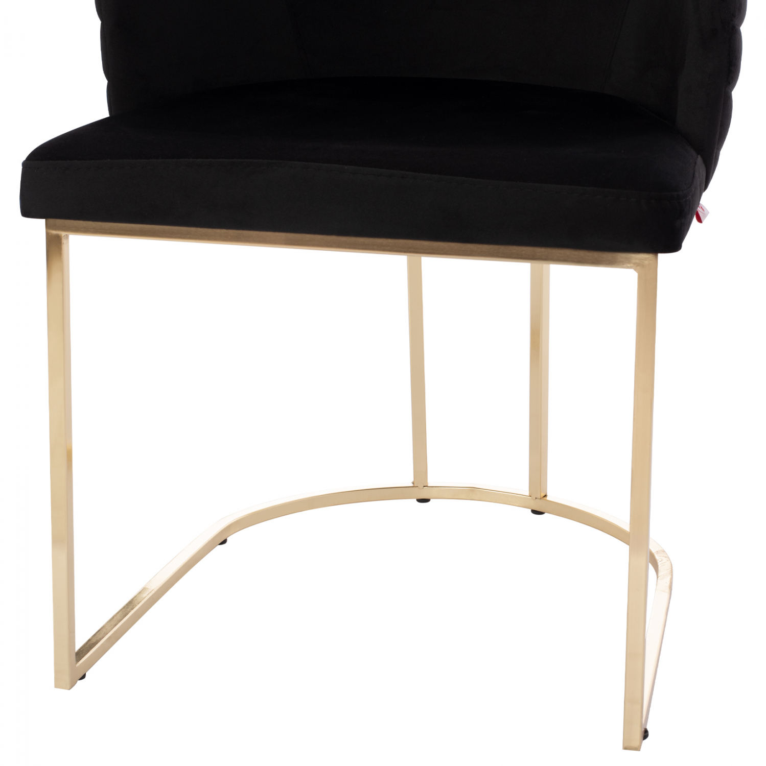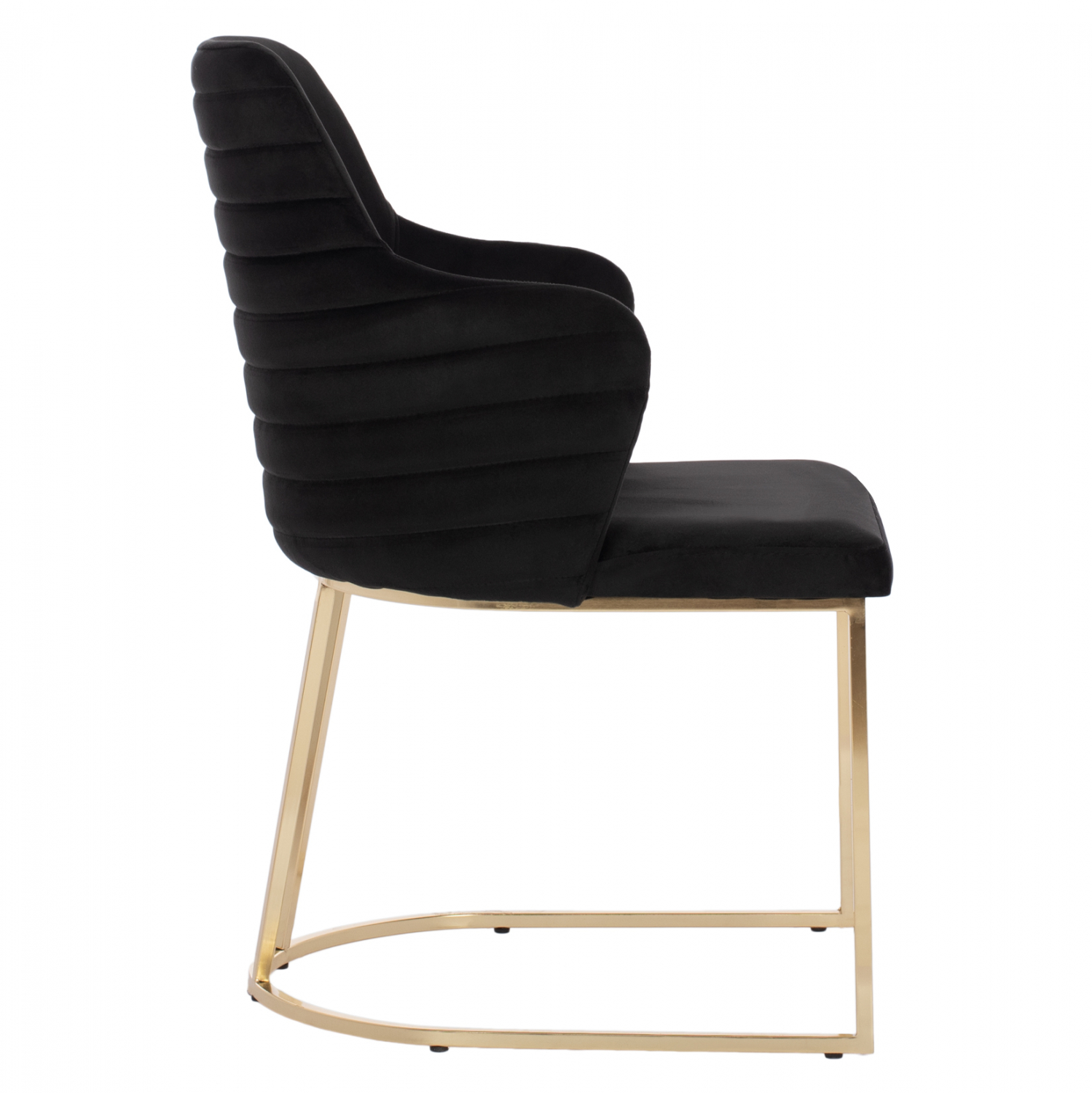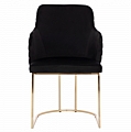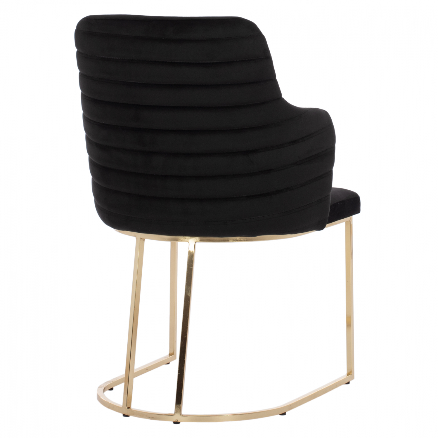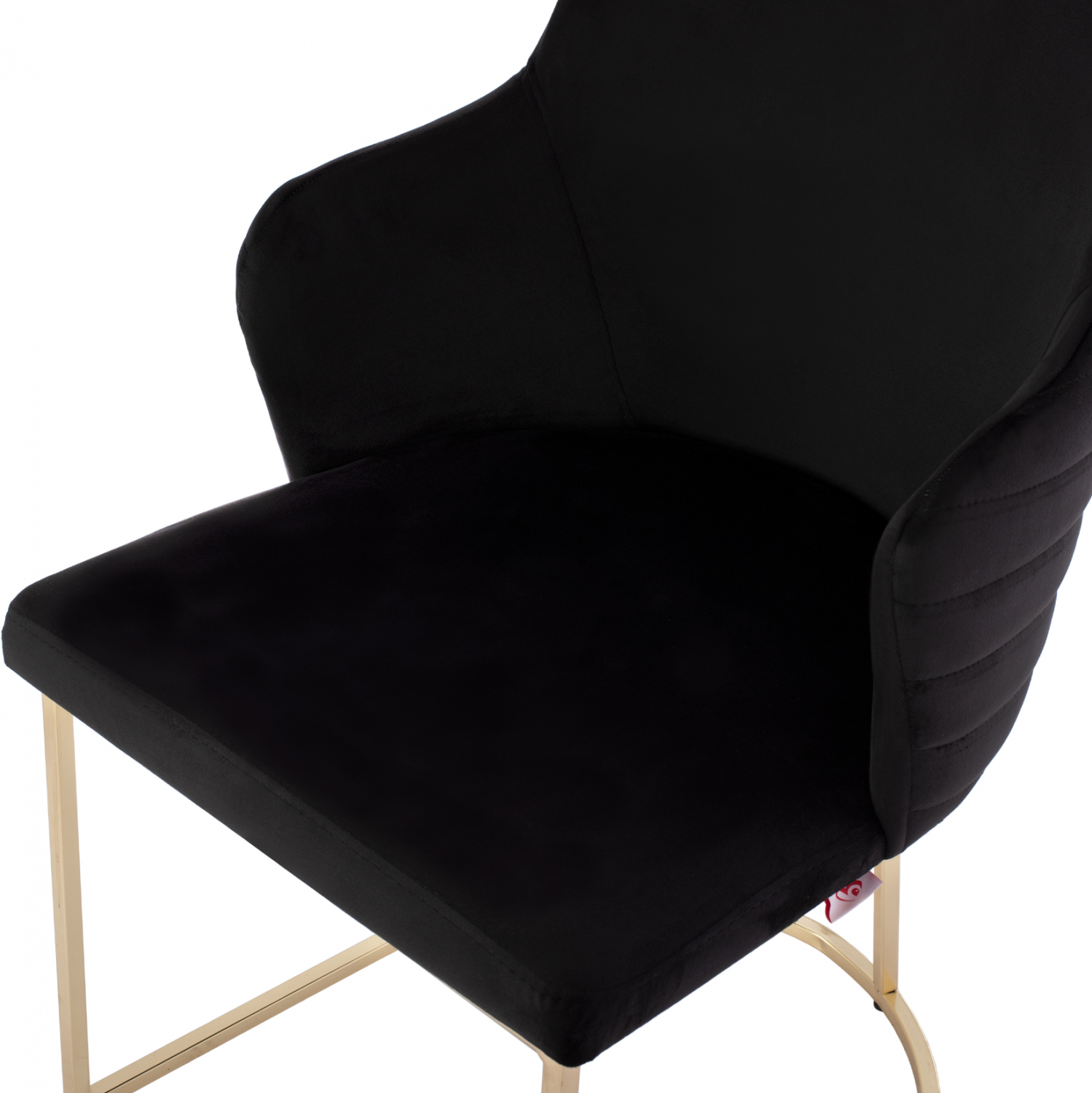 Πολυθρόνα SOLANA σε Μαύρο χρώμα με μεταλλικά πόδια σε χρυσή απόχρωση. Τα πόδια είναι σε ημικυκλική διάταξη με 4 κάθετα σταθερά πάνω στο μεταλλικό ημικύκλιο. Μια πολυθρόνα που δίνει κάτι το ξεχωριστό σε οποιοδήποτε επαγγελματικό χώρο. Λιτή, ποιοτική και κομψή σίγουρα θα τραβήξει τα βλέμματα. Το εξωτερικό της μεσαίου ύψους πλάτης φέρει οριζόντιες ραφές στην βελούδινη επένδυση, πράγμα που επιτείνει τον ιδιαίτερο χαρακτήρα αυτής της πολυθρόνας.