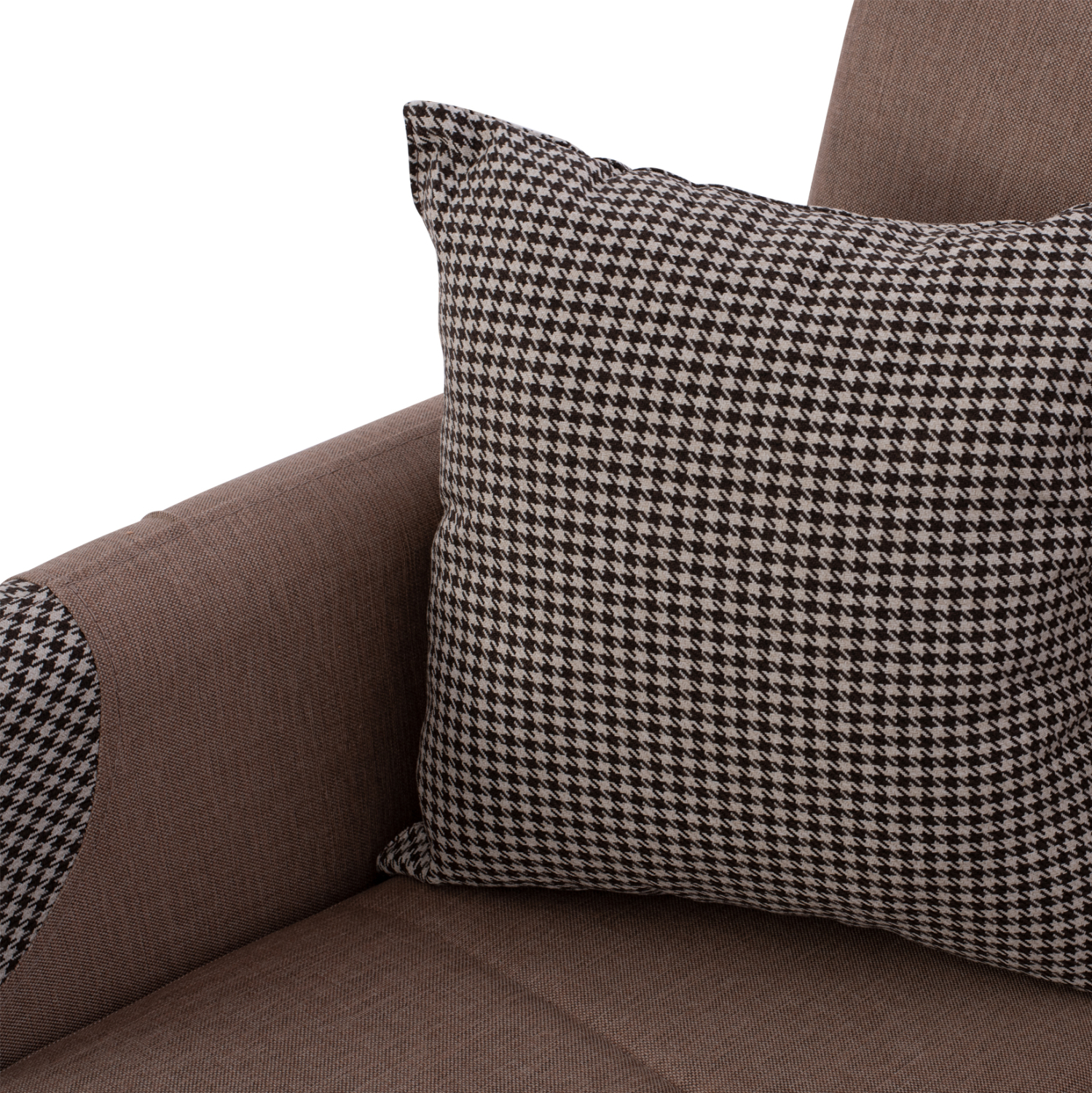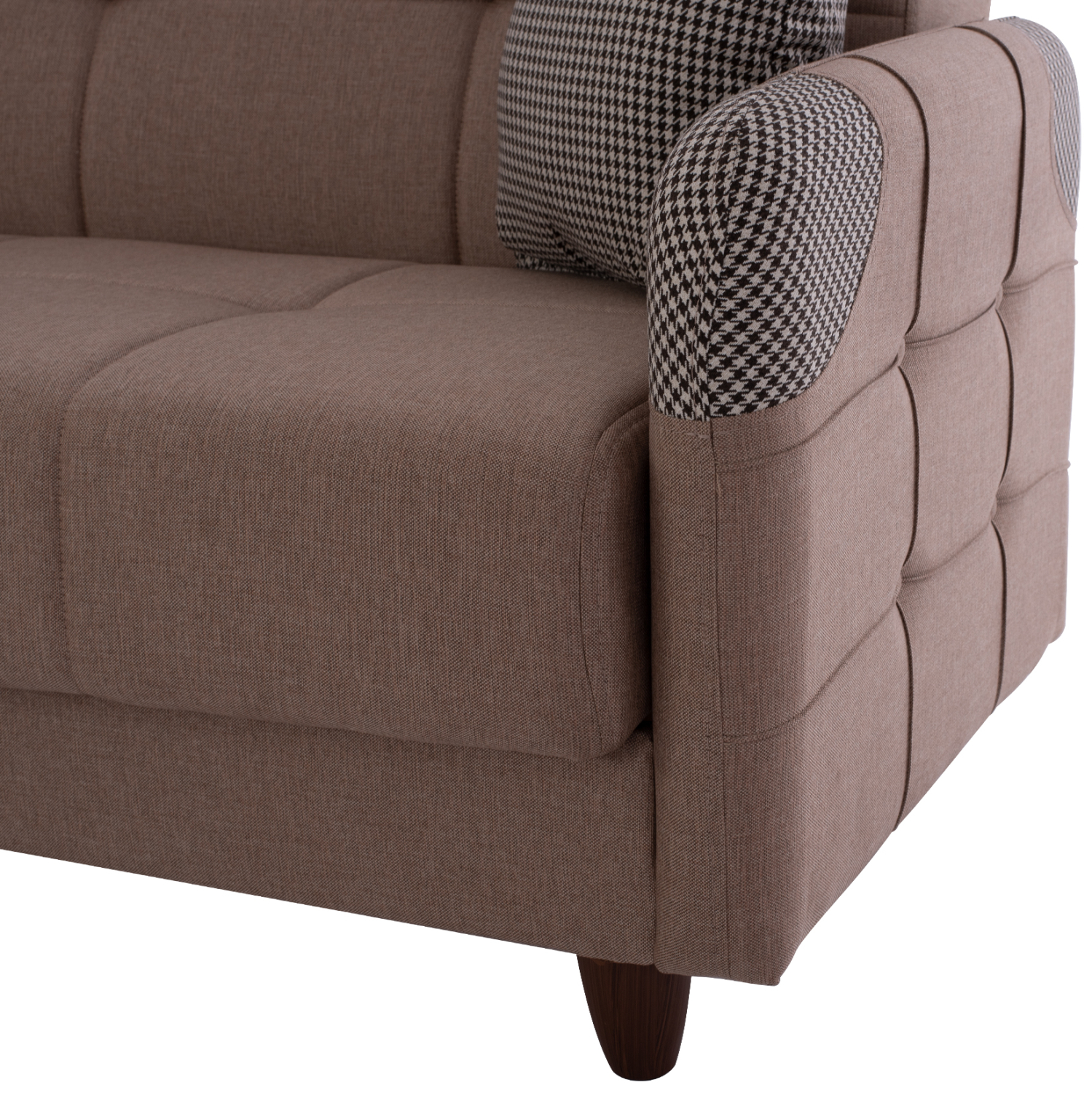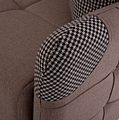 Η επένδυσή του είναι με εξαιρετικής ποιότητας μπεζ ύφασμα ενώ τα διακοσμητικά μαξιλαράκια, του δίνουν μια διαφορετική αισθητική πινελιά με ύφασμα σε καρό σχεδιασμό που υπάρχει και στις εμπρός γωνίες των μπράτσων. Η επένδυση έχει τεχνοτροπία καπιτονέ σε μεγάλα τετράγωνα τόσο στο άνετο κάθισμα και στην πλάτη, όσο και στα λεπτά μπράτσα.