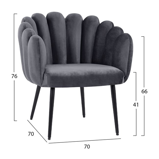 Η πολυθρόνα FB98631.01 είναι ξεχωριστή! Μοντέρνα, άνετη και σταθερή! Το κυρίαρχο χρώμα είναι το ουδέτερο ΓΚΡΙ, ενώ τα 4 πόδια είναι σε μαύρο χρώμα. Το ημικυκλικό design της πολυθρόνας είναι άνετο και αποτελείται από 11 κάθετα βελούδινα «δάχτυλα» που της δίνουν αυτή την πολύ ιδιαίτερη όψη, ενώ η πολυθρόνα δίνει την αίσθηση ότι αγκαλιάζει το σώμα. Πρόκειται για μια πρόταση λιτή που θα ταιριάξει σχεδόν παντού!