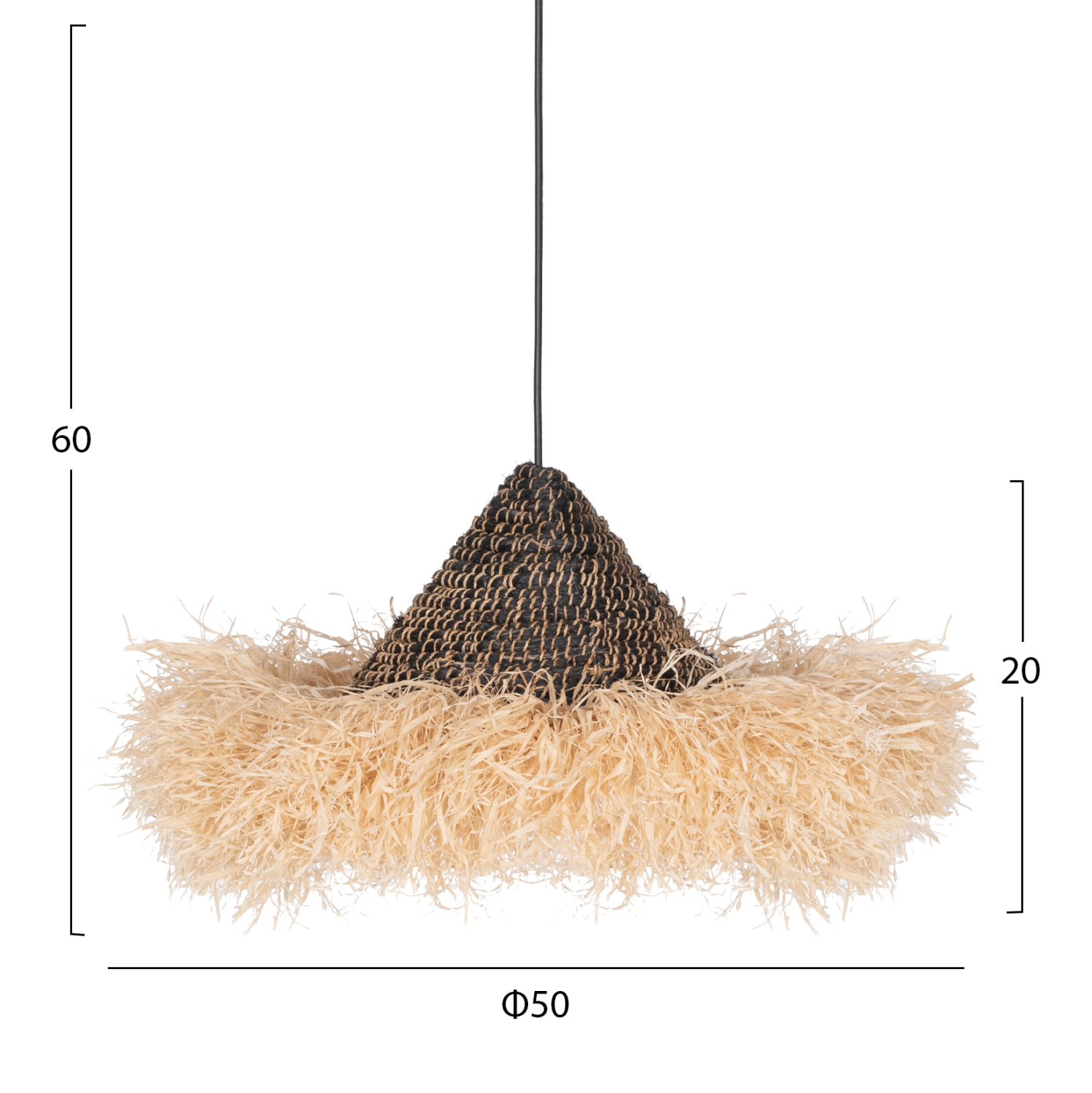 FB97789- Kρεμαστό φωτιστικό---- Αν επιθυμείτε να διακοσμήσετε το χώρο σας με ένα φωτιστικό σε boho στυλ με εξωτικά υλικά, αυτό είναι μια χαρακτηριστική επιλογή. Είναι ένα μονόφωτο με «καπέλο» φτιαγμένο από φουντωτές ίνες σιζάλ σε φυσικό χρώμα και ανακυκλωμένες ίνες κάνναβης Μανίλας σε μαύρο χρώμα.