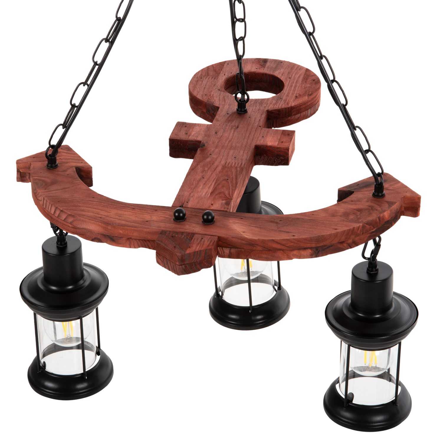 Ανακαλύψτε το εντυπωσιακό 3-φωτο φωτιστικό οροφής FB94115. Ένα φωτιστικό που θα αποτελέσει το κέντρο του ενδιαφέροντος χάρη στο εντυπωσιακό και εμπνευσμένο του design. Τα 3 φαναράκια που περιέχουν τους λαμπτήρες κρέμονται από μια ξύλινη άγκυρα, η οποία με την σειρά της κρέμεται από την οροφή με αλυσίδες.