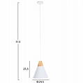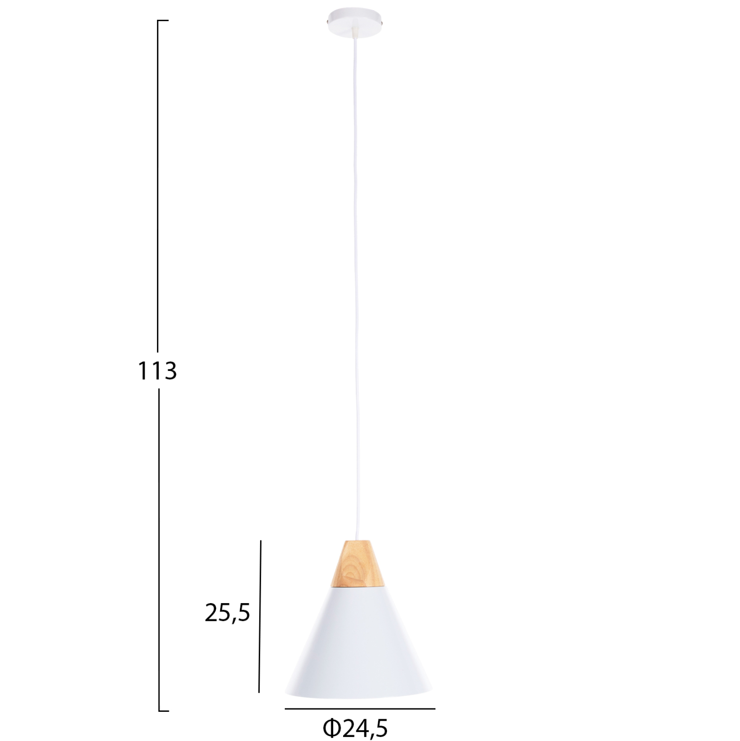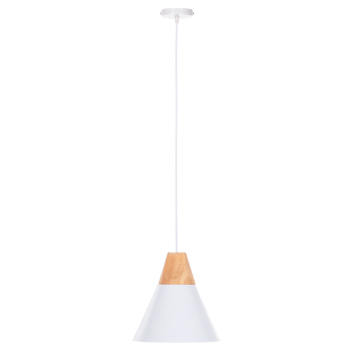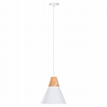 Ανακαλύψτε αυτό το νέο μας κρεμαστό φωτιστικό οροφής και ολοκληρώστε την διακόσμησή σας. Πρόκειται για ένα φωτιστικό με ΛΕΥΚΟ μεταλλικό καπέλο σε σχήμα κωνικής καμπάνας με λεπτομέρεια ξύλου στην κορυφή του φωτιστικού. Αισθητικά, ολοκληρώνεται με το επίσης ΛΕΥΚΟ καλώδιο κρέμασης και την λευκή βάση οροφής, και αποτελεί την τελευταία τάση στα φωτιστικά οροφής.