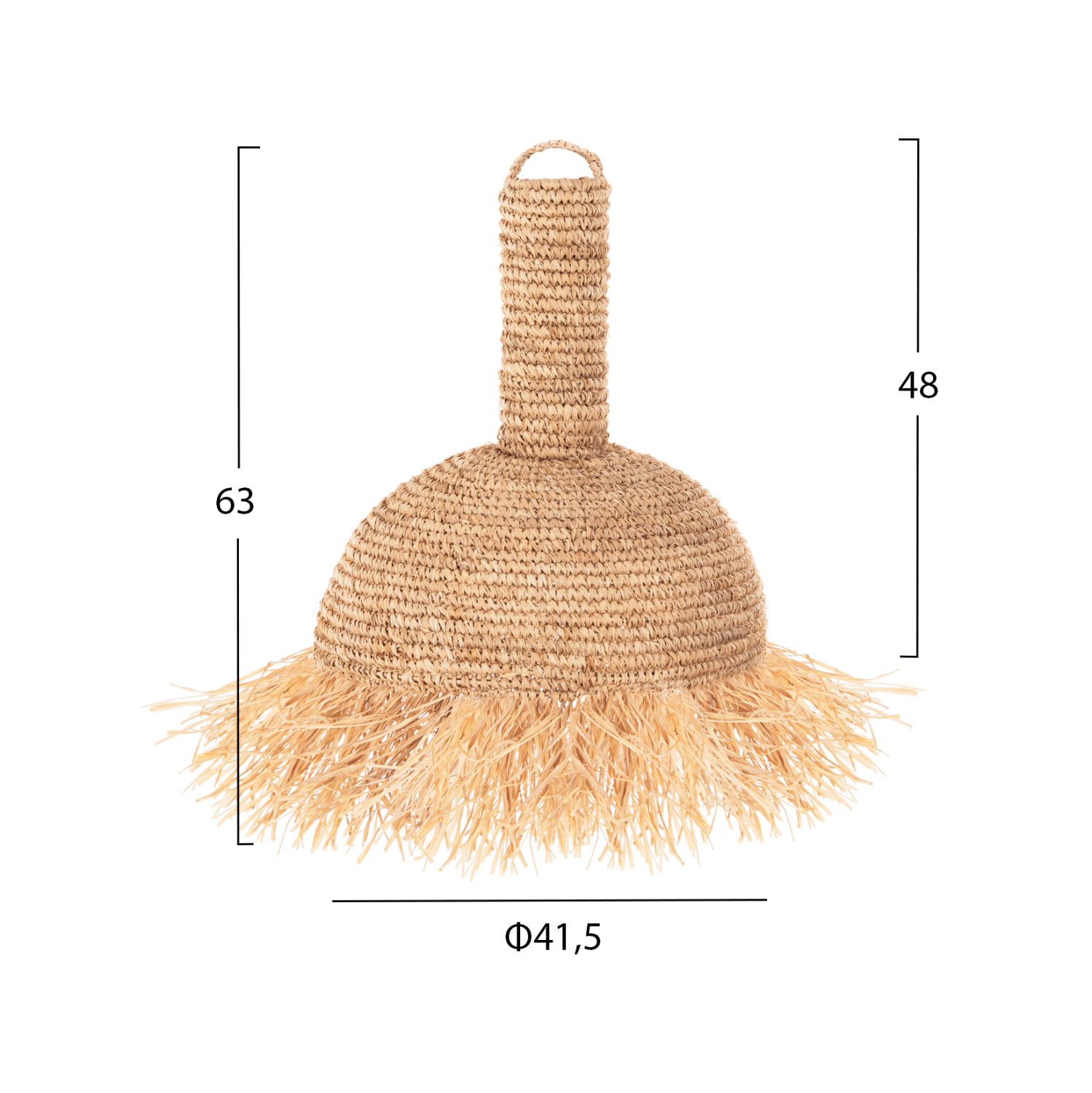 FB97855- Kρεμαστό φωτιστικό---- Αν επιθυμείτε να διακοσμήσετε το χώρο σας με ένα φωτιστικό σε boho στυλ με εξωτικά υλικά, αυτό είναι μια χαρακτηριστική επιλογή. Είναι ένα μονόφωτο με «καπέλο» σε σχήμα καμπάνας φτιαγμένο από ίνες φύλλων φοίνικα με κρόσια, σε ΦΥΣΙΚΟ χρώμα. Διαθέτει και χερούλι κρέμασης.