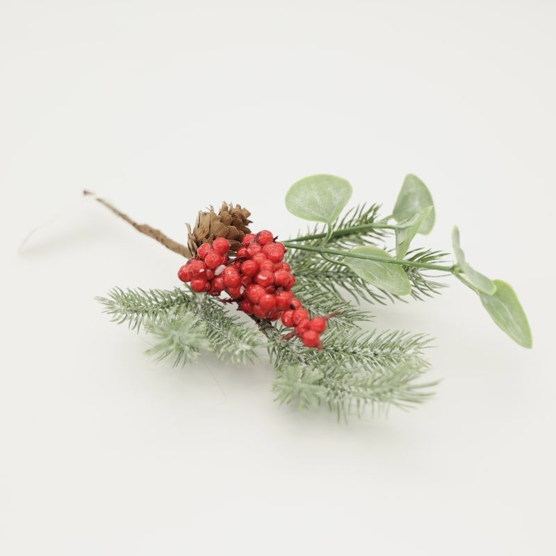 Χριστουγεννιάτικο διακοσμητικό κλαδάκι με πράσινα φύλλα ελάτου, ρόδι και κουκουνάρι, ιδανικό για φυσική και γιορτινή διακόσμηση. Ο συνδυασμός κόκκινου και πράσινου χρώματος αποπνέει ζεστασιά και παραδοσιακό χριστουγεννιάτικο χαρακτήρα.
