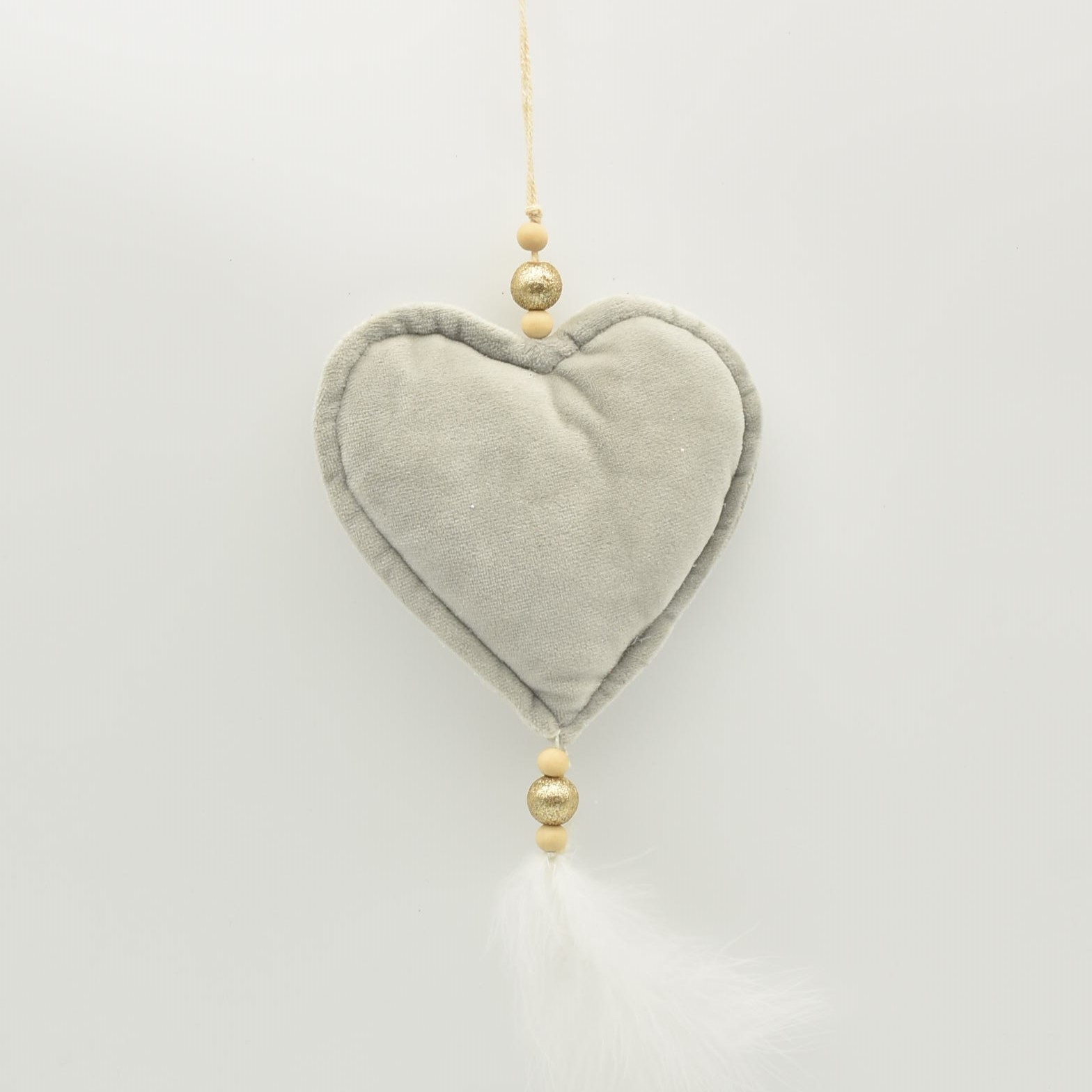 Στολίδι κρεμαστή υφασμάτινη γκρι καρδιά με λευκό πούπουλο στο τέλος
