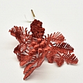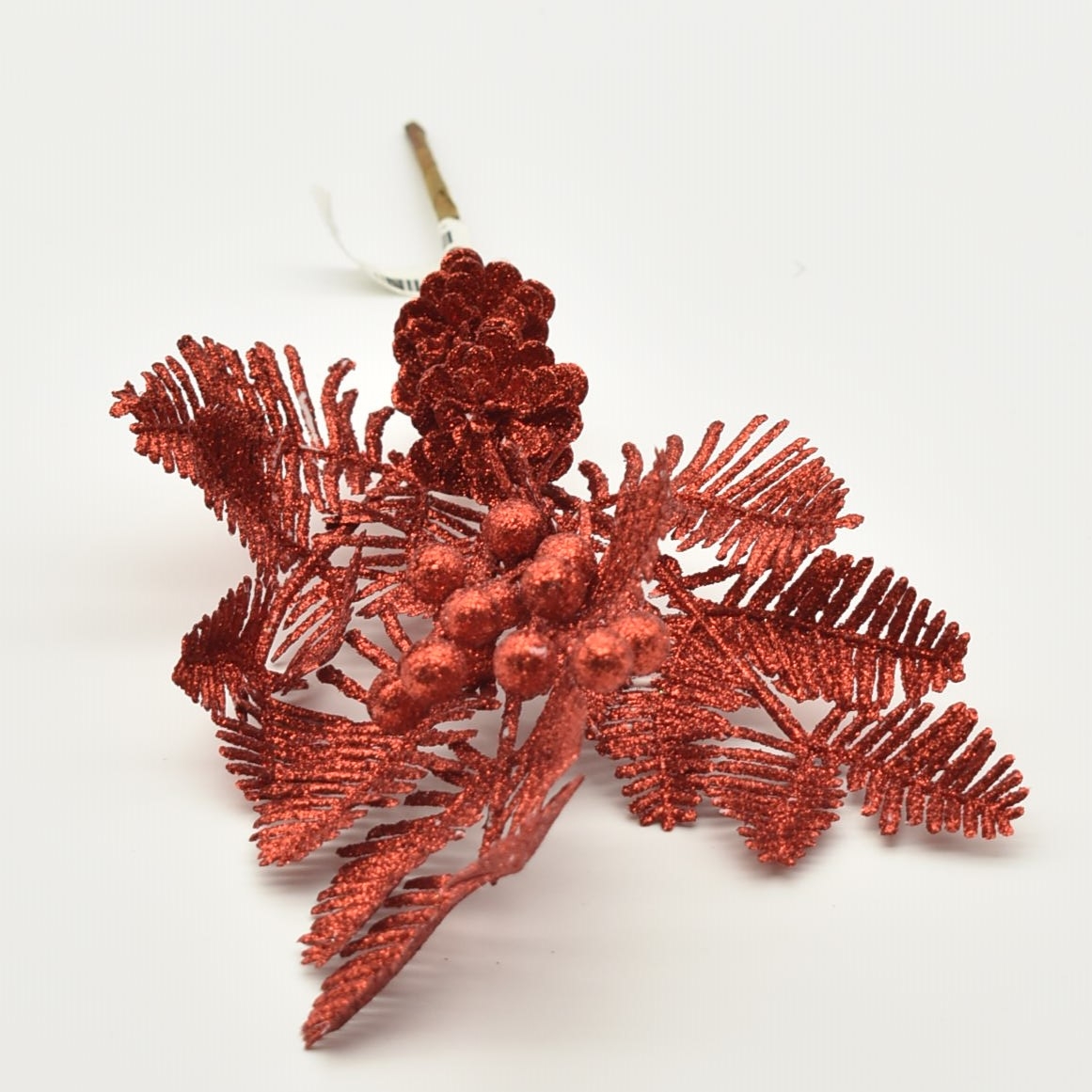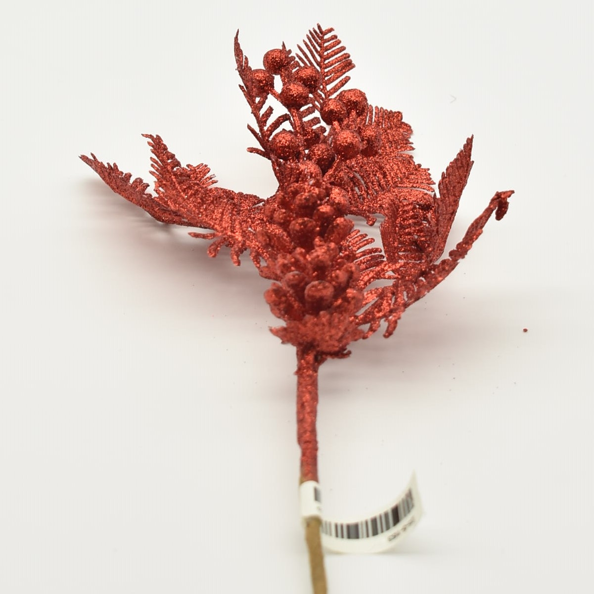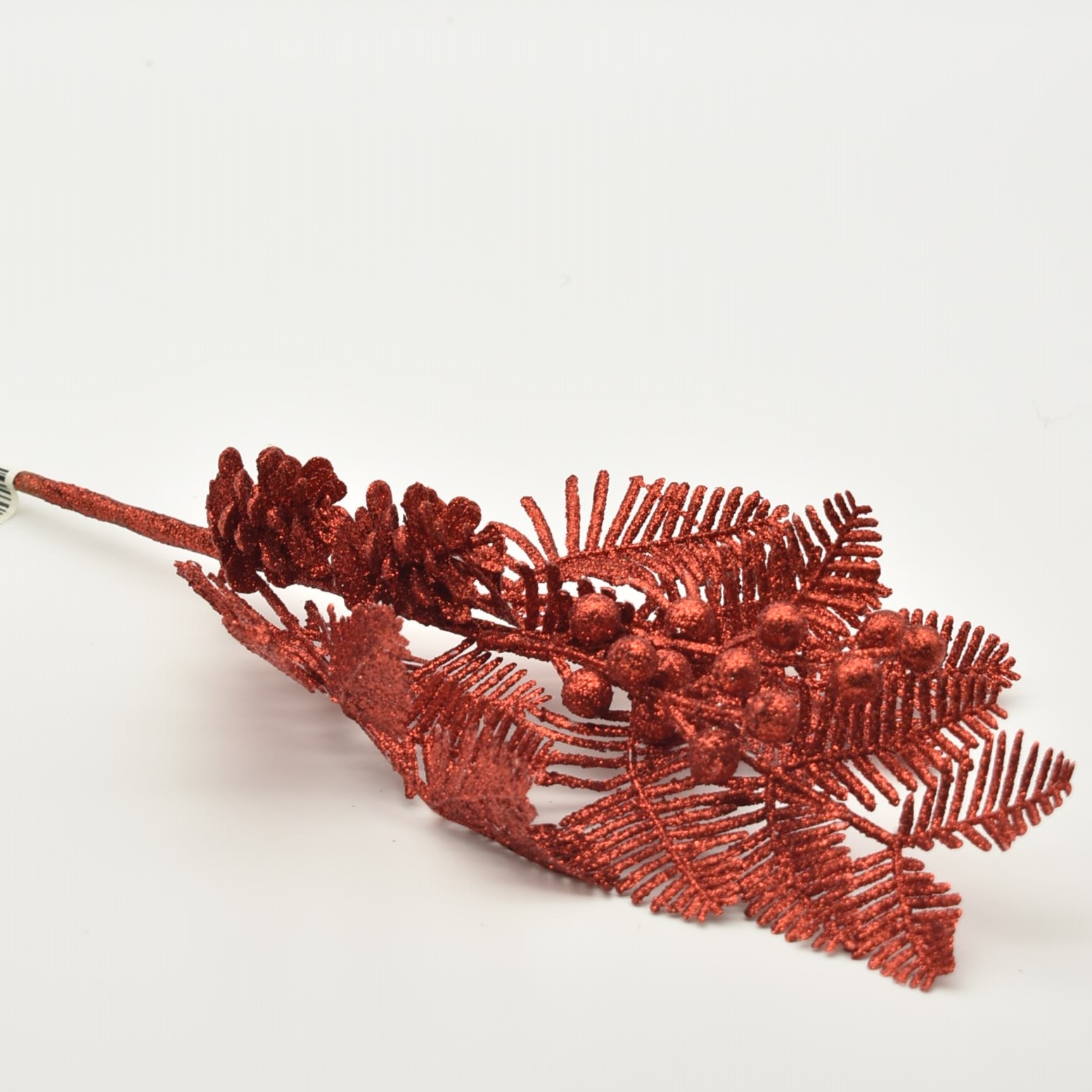 Χριστουγεννιάτικο διακοσμητικό κλαδί (φύλλα, κουκουνάρια και berries) χρώμα κόκκινο glitter
