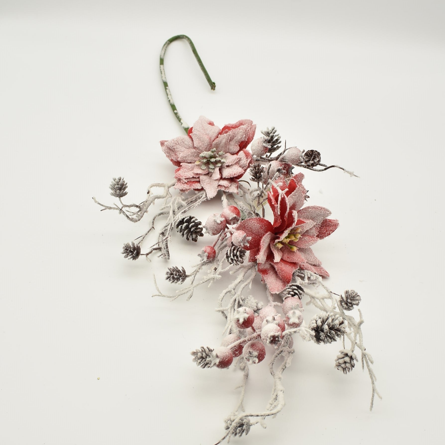 Χριστουγεννιάτικο χιονισμένο διακοσμητικό κλαδί με berries, κουκουνάρια και μικρά αλεξανδρινά λουλούδια