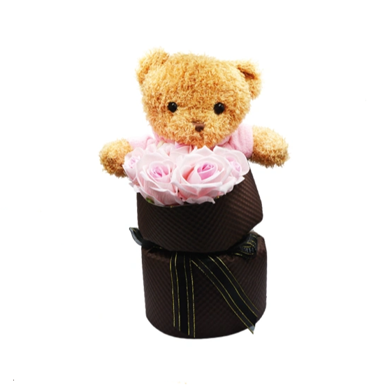 Λούτρινο Aρκουδάκι με μπουκέτο λουλουδια ροζ και φωτάκια