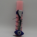 Χειροποίητη πλακέ ροζ λαμπάδα με ασημί-μπλε κορδέλα και μπρελόκ μάτι καλυμμένο με στρας