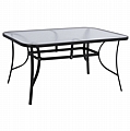 Τραπέζι FB95145.03 εξωτερικού χώρου με ΜΑΥΡΟ μεταλλικό σκελετό και γυάλινη θολή επιφάνεια! Πρόκειται για πολύ δημοφιλές τραπέζι που δεν λείπει σχεδόν από κανέναν μπαλκόνι ή κήπο. Είναι ορθογώνιο με γωνίες στρογγυλεμένες ενώ το γυαλί της επιφάνειας είναι ενισχυμένο.
