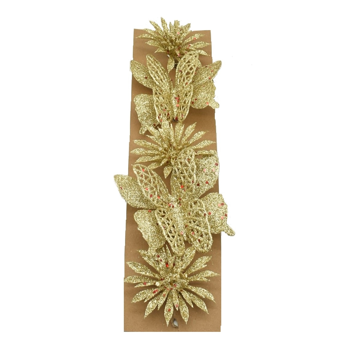 Διακοσμητικό πικ χρώμα χρυσό glitter σχέδιο λουλούδια-πεταλούδες 5τμχ
