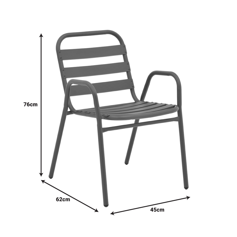 - Σταθερός σκελετός από μέταλλο εξαιρετικής ποιότητας με αντοχή σε φθορά και χρόνο, ενώ τα κομμάτια έδρας και πλάτης είναι κατασκευασμένα από φέτες αλουμινίου. Το μέταλλο παρέχει ανθεκτικότητα και σταθερότητα, ενώ οι φέτες αλουμινίου προσθέτουν ελαφρότητα και μια μοντέρνα αίσθηση στον σχεδιασμό. Η πολυθρόνα αυτή είναι ιδανική για χρήση σε εξωτερικούς χώρους, καθώς η ανθεκτικότητα στις καιρικές συνθήκες του αλουμινίου την καθιστά ανθεκτική σε έκθεση στον ήλιο και την υγρασία.