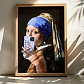 Αυτό το έργο είναι μια χιούμορ και έξυπνη ανατροπή ενός κλασικού αριστουργήματος. Η «Κοπέλα με το μαργαριταρένιο σκουλαρίκι» ξαναζωντανεύει ως σύγχρονο icon, κρατώντας το κινητό της για μια selfie. Είναι το ιδανικό κομμάτι για όσους αγαπούν τις αντιθέσεις και θέλουν να γεμίσουν τον χώρο τους με δυναμισμό, χιούμορ και χαρακτήρα. Φέρτε έναν αέρα αντισυμβατικότητας και καλλιτεχνικής ελευθερίας σε κάθε δωμάτιο.