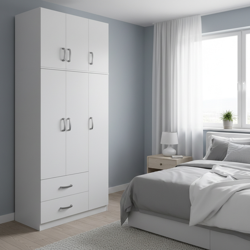 - Περιλαμβάνει τρεις πόρτες, εσωτερικά φέρει ράγα για κρεμάστρες και ράφια ενώ κάτω φέρει δύο μεγάλα συρτάρια για την αποθήκευση ρούχων και αξεσουάρ.