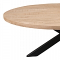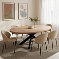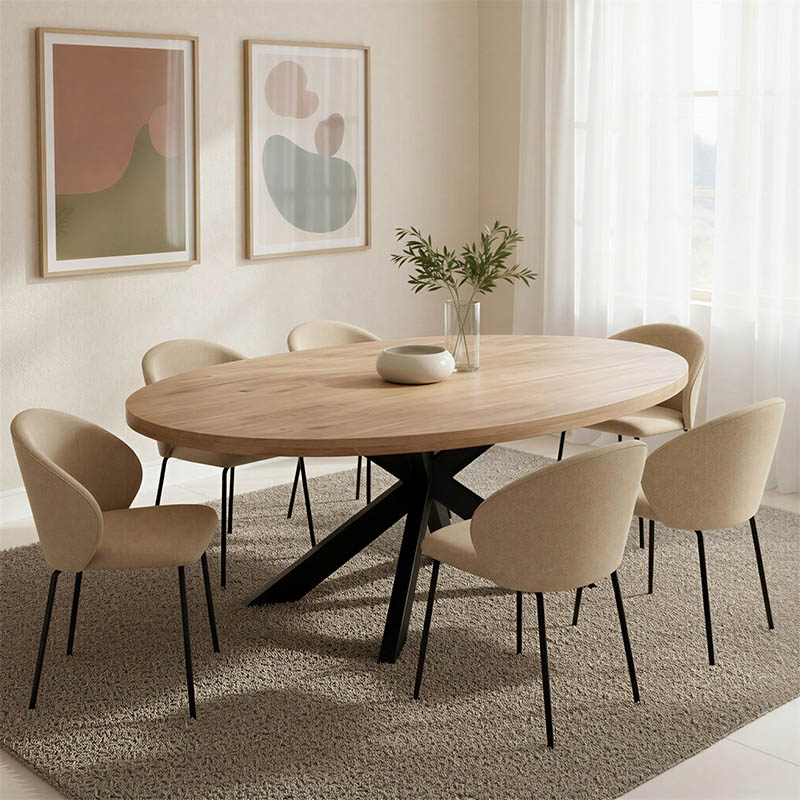- Μοναδικός Σχεδιασμός: Η οβάλ επιφάνεια από μασίφ ξύλο, με το εντυπωσιακό ακτινωτό μοτίβο, προσδίδει μια αίσθηση ζεστασιάς και εκλεπτυσμένης ρουστίκ κομψότητας. Κάθε τραπέζι είναι μοναδικό, με τους φυσικούς κόκκους του ξύλου να αφηγούνται τη δική τους ιστορία.