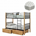 --Σας παρουσιάζουμε τo κρεβάτι-κουκέτα FB921336.02 σε συνδυασμό ξύλου- μετάλλου για μονά στρώματα 90x190εκ. Τα 4 πόδια-κολώνες του κρεβατιού είναι τα ξύλινα κομμάτια της σύνθεσης σε χρώμα ΟΞΙΑΣ, ενώ το κεφαλάρι, το ποδαρικό, τα πλαϊνά, η σκάλα, τα κάγκελα, και οι τάβλες στήριξης του στρώματος είναι όλα μεταλλικά σε ΜΑΥΡΟ χρώμα. Η πρόσβαση στο επάνω κρεβάτι γίνεται με μια μεταλλική σκάλα που τοποθετείται βιδωτή στον σκελετό. Στο επάνω κρεβάτι υπάρχουν πλαϊνά προστατευτικά κάγκελα που προσφέρουν ασφάλεια από πτώσεις. Διαθέτει δύο συρτάρια δαπέδου με ροδάκια, που τοποθετούνται κάτω από το κρεβάτι, και διαθέτουν όμορφη πρόσοψη μελαμίνης σε χρώμα παρόμοιο με τον σκελετό του κρεβατιού.