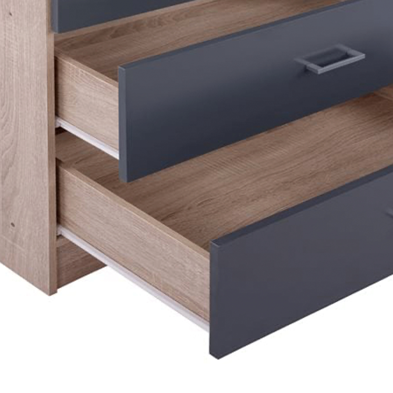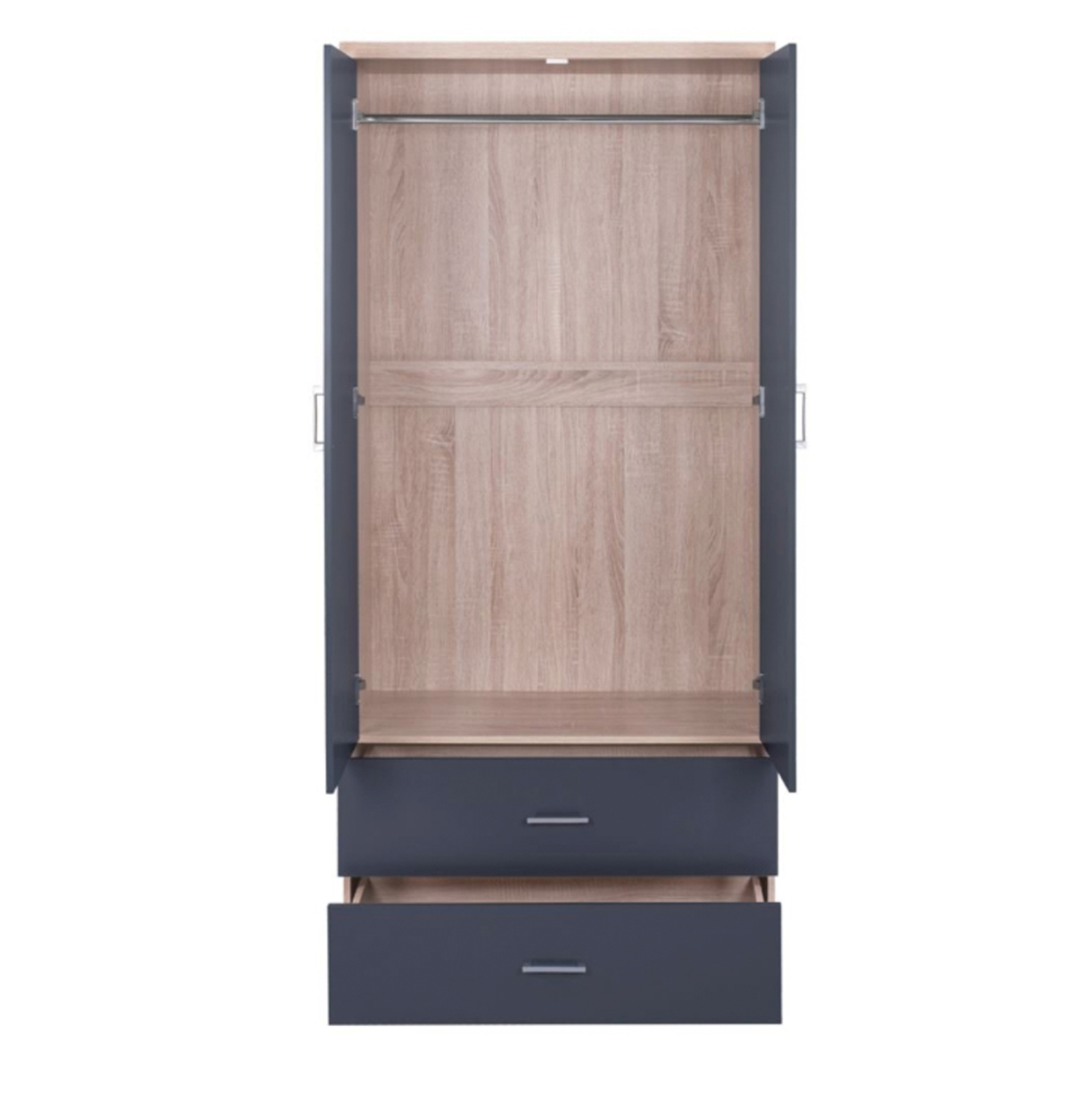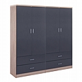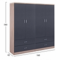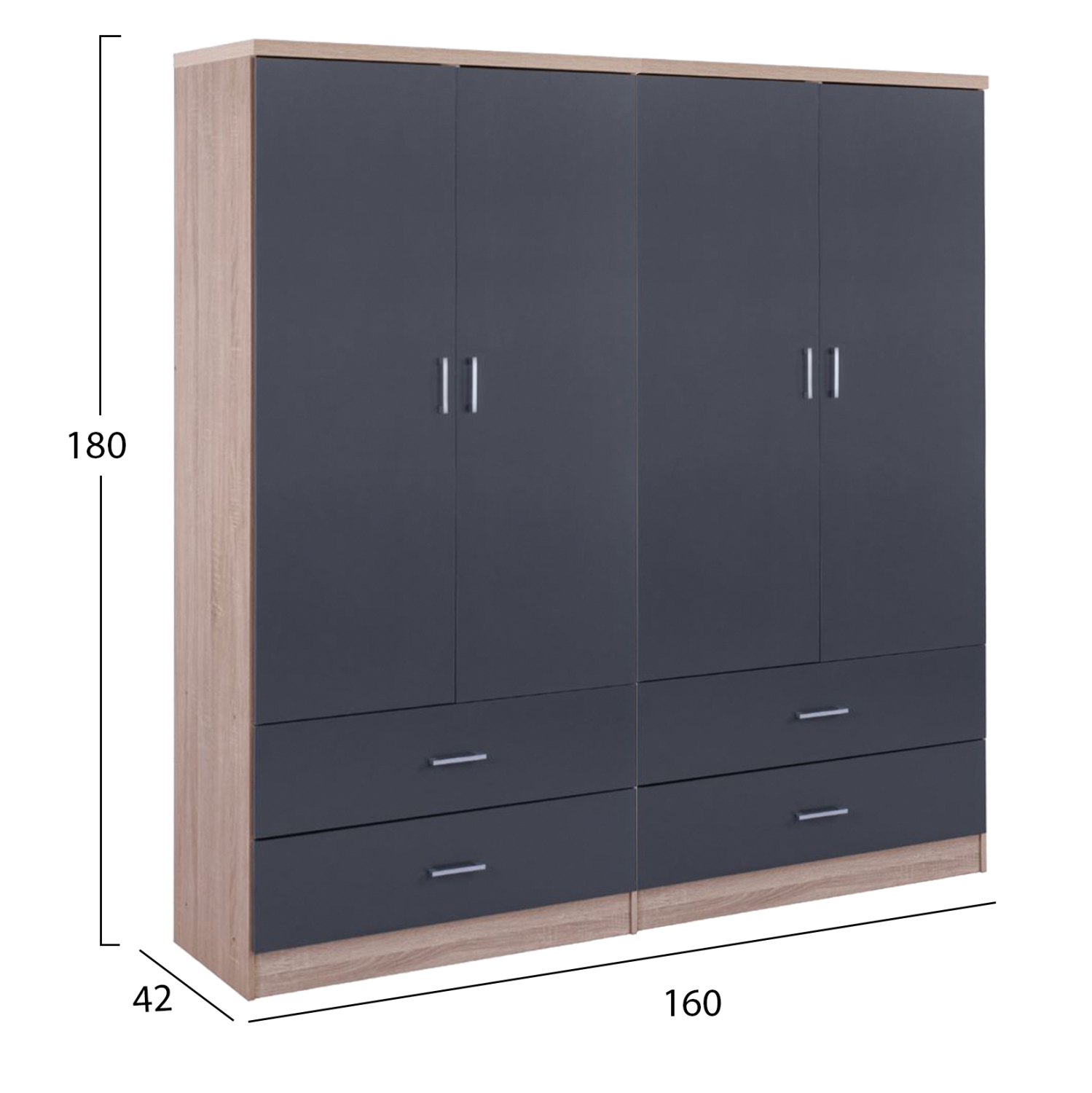 Γνωρίστε την 4-φυλλη ντουλάπα-γκαρνταρόμπα FB921259 (2 δίφυλλες). Πρόκειται για μια μεγάλη ντουλάπα με 4 πόρτες, και στο εσωτερικό της υπάρχει μόνο μια INOX μπάρα για κρέμαση ρούχων. Κάτω ακριβώς από τον χώρο της γκαρνταρόμπας υπάρχουν και 4 ευρύχωρα συρτάρια. Οι πόρτες αλλά και τα συρτάρια ανοίγουν με καλαίσθητα ασημί χερούλια. Είναι κατασκευασμένη από μελαμίνη σε ΓΚΡΙ χρώμα με SONAMA πλαίσιο, και αισθητικά μπορεί να ταιριάξει με πολλά άλλα στυλ, χάρη και στις «καθαρές» γραμμές της.