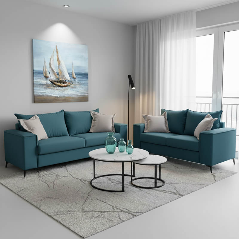 - Χρώμα καναπέ και μαξιλαριών πλάτης: Μπλε - Φέρει δύο διακοσμητικά μαξιλαράκια σε χρώμα ανοιχτό γκρι στον διθέσιο και δύο στον τριθέσιο καναπέ.