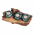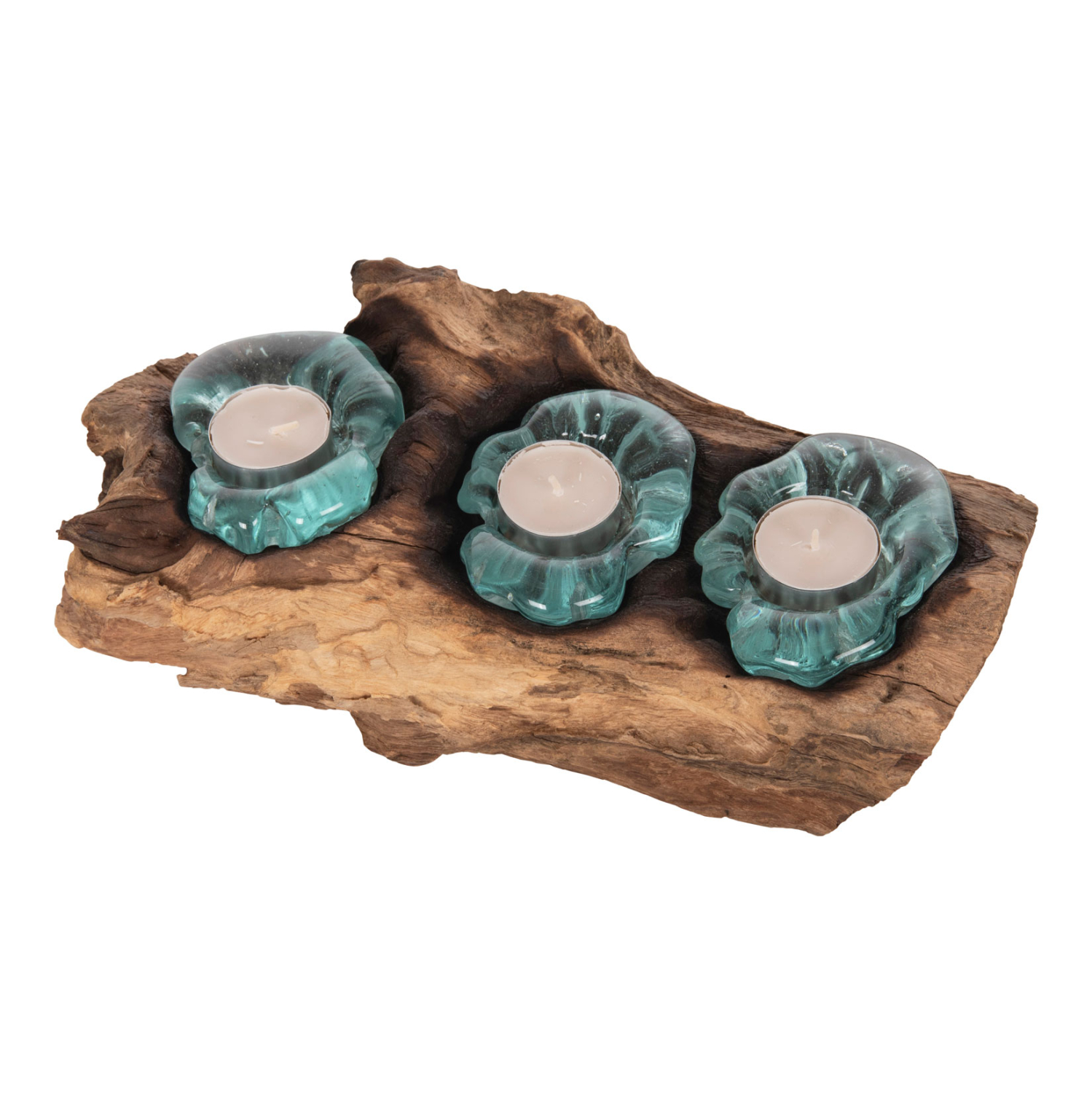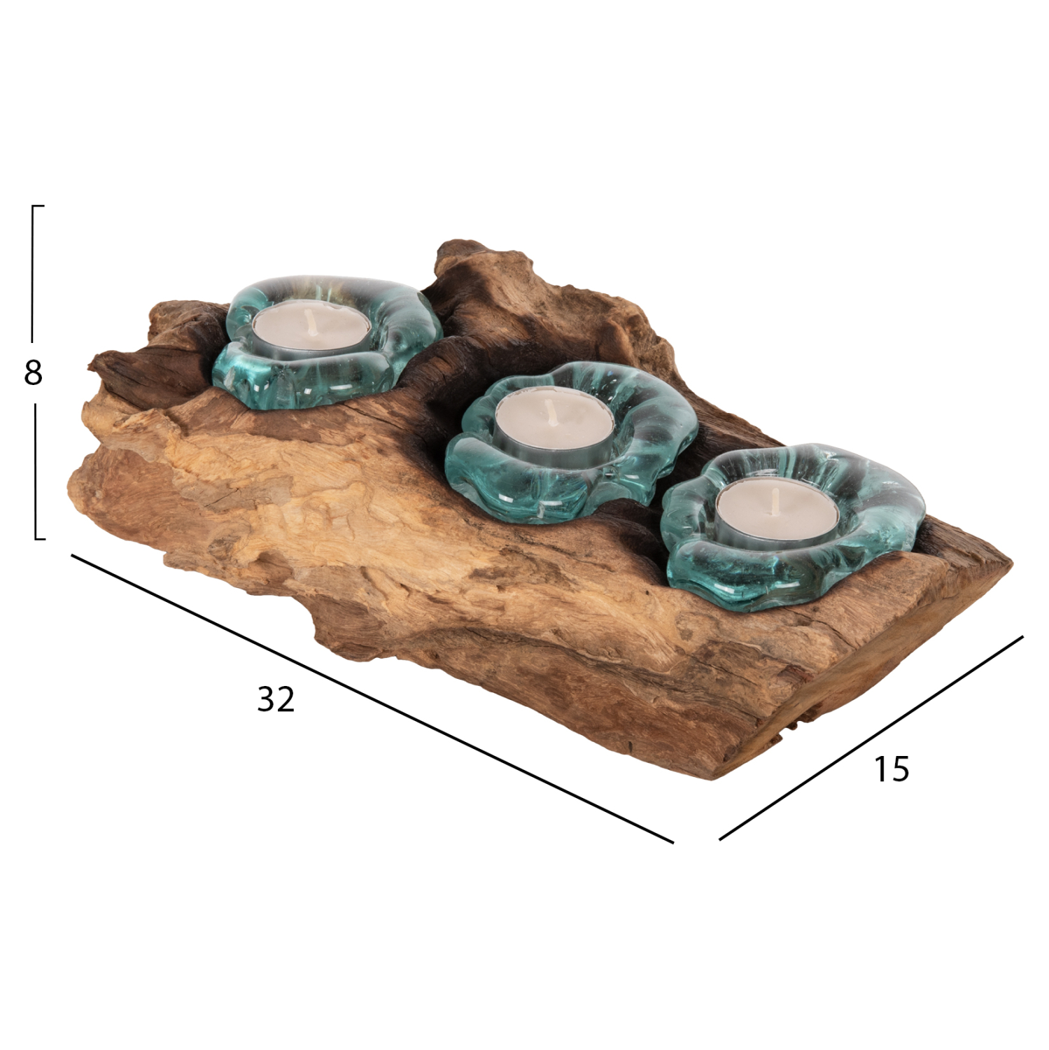 Το επιτραπέζιο διακοσμητικό FB94282 είναι μια βάση για 3 κεράκια ρεσό κατασκευασμένη από μασίφ ξύλο ΤΕΑΚ. Οι βάσεις για τα ρεσό είναι από γυαλί. Οι οπαδοί του ρουστίκ στυλ στην διακόσμηση θα ενθουσιαστούν με αυτή την πρόταση.