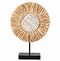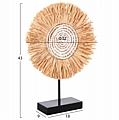 Αυτό το επιτραπέζιο διακοσμητικό σε στρόγγυλο σχήμα, είναι κατασκευασμένο από αποξηραμένες ίνες raffia, και είναι τοποθετημένο σε μια μαύρη ξύλινη βάση. Η ίνα raffia λαμβάνεται με το ξεφλούδισμα των φύλλων φοίνικα ραφίας. Οι φοίνικες Raffia είναι ένα γένος περίπου είκοσι ειδών φοινίκων που προέρχονται από τροπικές περιοχές της Αφρικής, και ιδιαίτερα της Μαδαγασκάρης, με ένα είδος να εμφανίζεται επίσης στην Κεντρική και Νότια Αμερική. Η ίνα ραφίας είναι μαλακή, εύκαμπτη, ισχυρή και ανθεκτική.