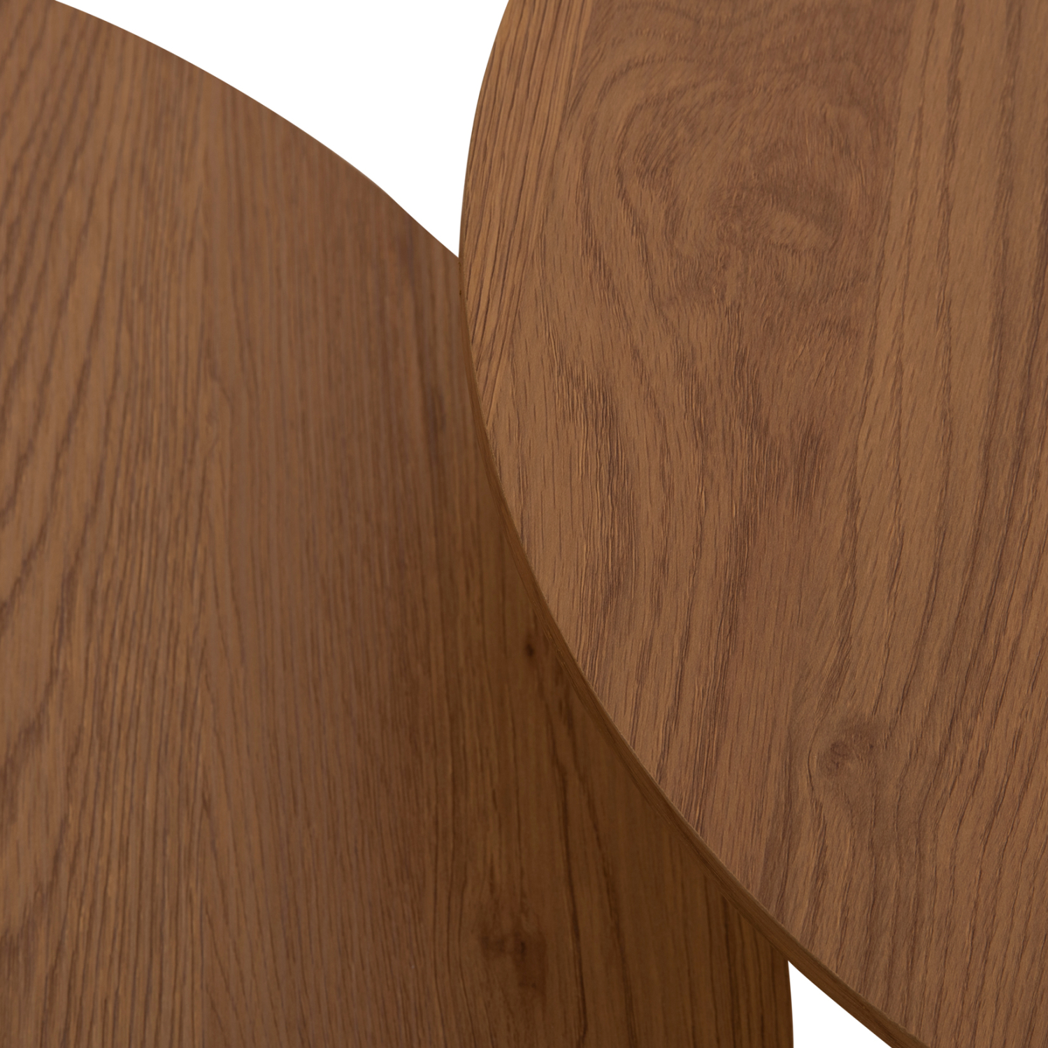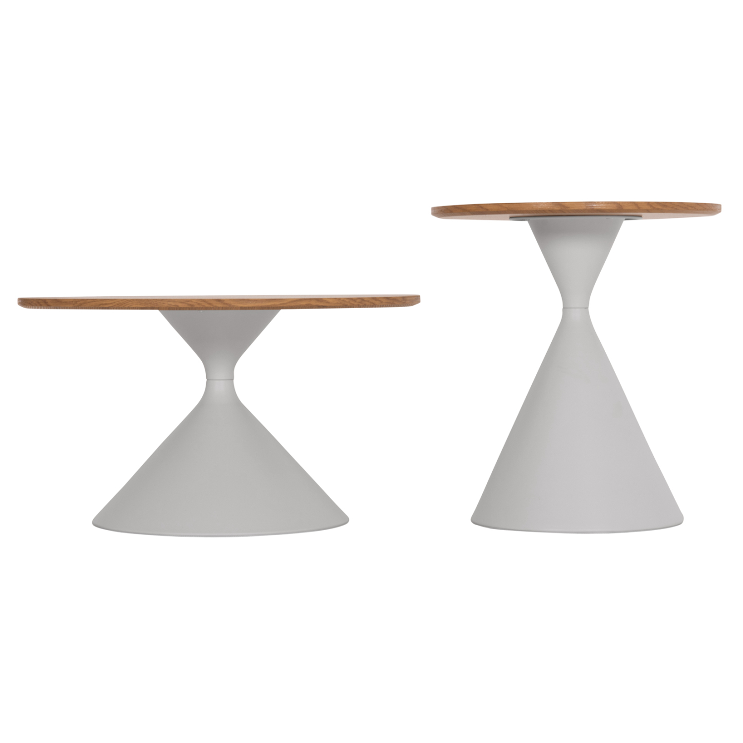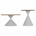 Αυτό το σετ τραπεζιών για το σαλόνι αποτελείται από 2 μεταλλικά τραπεζάκια στρογγυλά διαφορετικών μεγεθών. Οι βάσεις τους έχουν σχήμα κλεψύδρας σε ΛΕΥΚΟ ματ χρώμα, ενώ οι επιφάνειες είναι κατασκευασμένες από MDF σε φυσικό χρώμα. Ιδανικά τόσο για το σπίτι, όσο και για επαγγελματικούς χώρους.