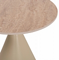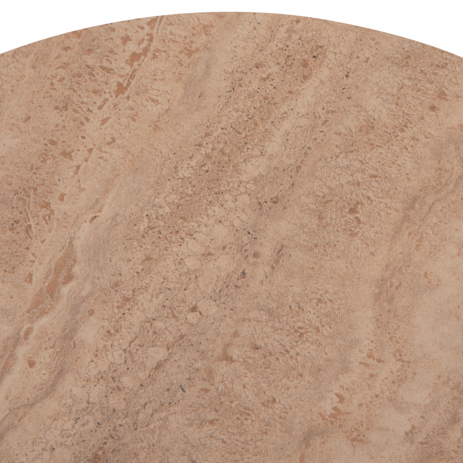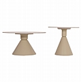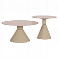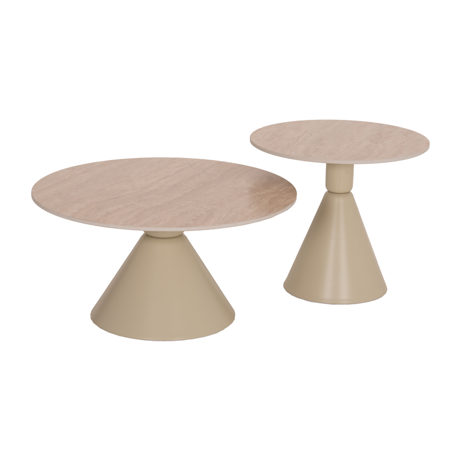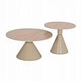 Αυτό το σετ τραπεζιών για το σαλόνι αποτελείται από 2 μεταλλικά τραπεζάκια στρογγυλά διαφορετικών μεγεθών. Οι βάσεις τους έχουν σχήμα κώνου σε ΣΑΜΠΑΝΙ χρώμα, ενώ οι επιφάνειες είναι κεραμικές glossy σε χρωματικό σχήμα πέτρας Τραβερτίνας. Ιδανικά τόσο για το σπίτι, όσο και για επαγγελματικούς χώρους.