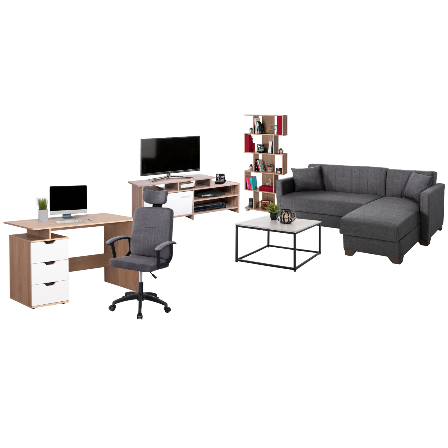 Αυτό το σετ περιλαμβάνει βιβλιοθήκη, τραπέζι σαλονιού, γραφείο, καρέκλα γραφείου, έπιπλο TV, και γωνιακό καναπέ-κρεβάτι με αποθηκευτικό χώρο!