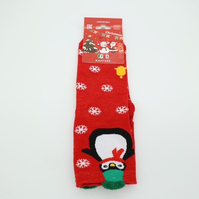 Οι κάλτσες αυτές είναι από λεπτό, ελαφρύ υλικό και προσφέρουν άνεση στην καθημερινή χρήση χωρίς να βαραίνουν το πόδι. Το κόκκινο χρώμα τους, διακοσμημένο με χιονονιφάδες και έναν χαριτωμένο πιγκουίνο, τους δίνει έναν έντονα γιορτινό χαρακτήρα.