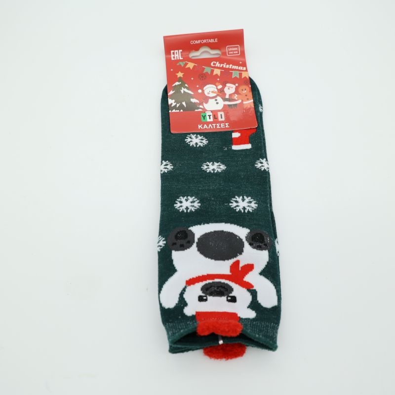 Οι κάλτσες αυτές είναι από λεπτό, ελαφρύ υλικό και προσφέρουν άνεση στην καθημερινή χρήση χωρίς να βαραίνουν το πόδι. Το σκούρο πράσινο χρώμα τους, διακοσμημένο με λεπτομέρειες λεύκες και μια χαριτωμένη πολική αρκούδα, τους δίνει έναν έντονα γιορτινό χαρακτήρα.