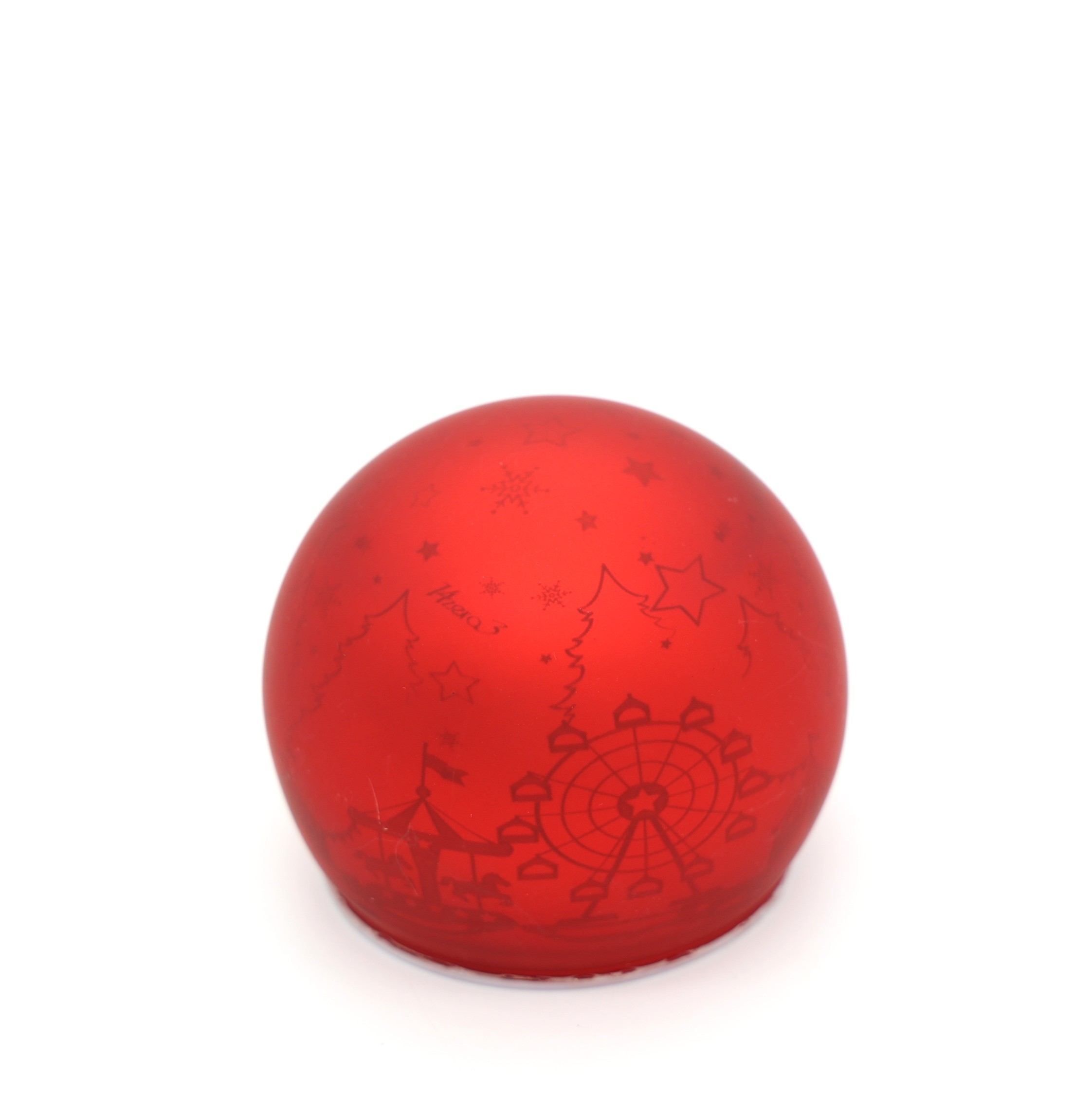 Κομψή φωτιζόμενη χριστουγεννιάτικη μπάλα σε έντονο κόκκινο χρώμα, διακοσμημένη με γιορτινά σχέδια από αστέρια, έλατα και λούνα παρκ. Όταν ανάβει, εκπέμπει απαλό, ζεστό φως που δημιουργεί μια όμορφη και χαλαρωτική χριστουγεννιάτικη ατμόσφαιρα.