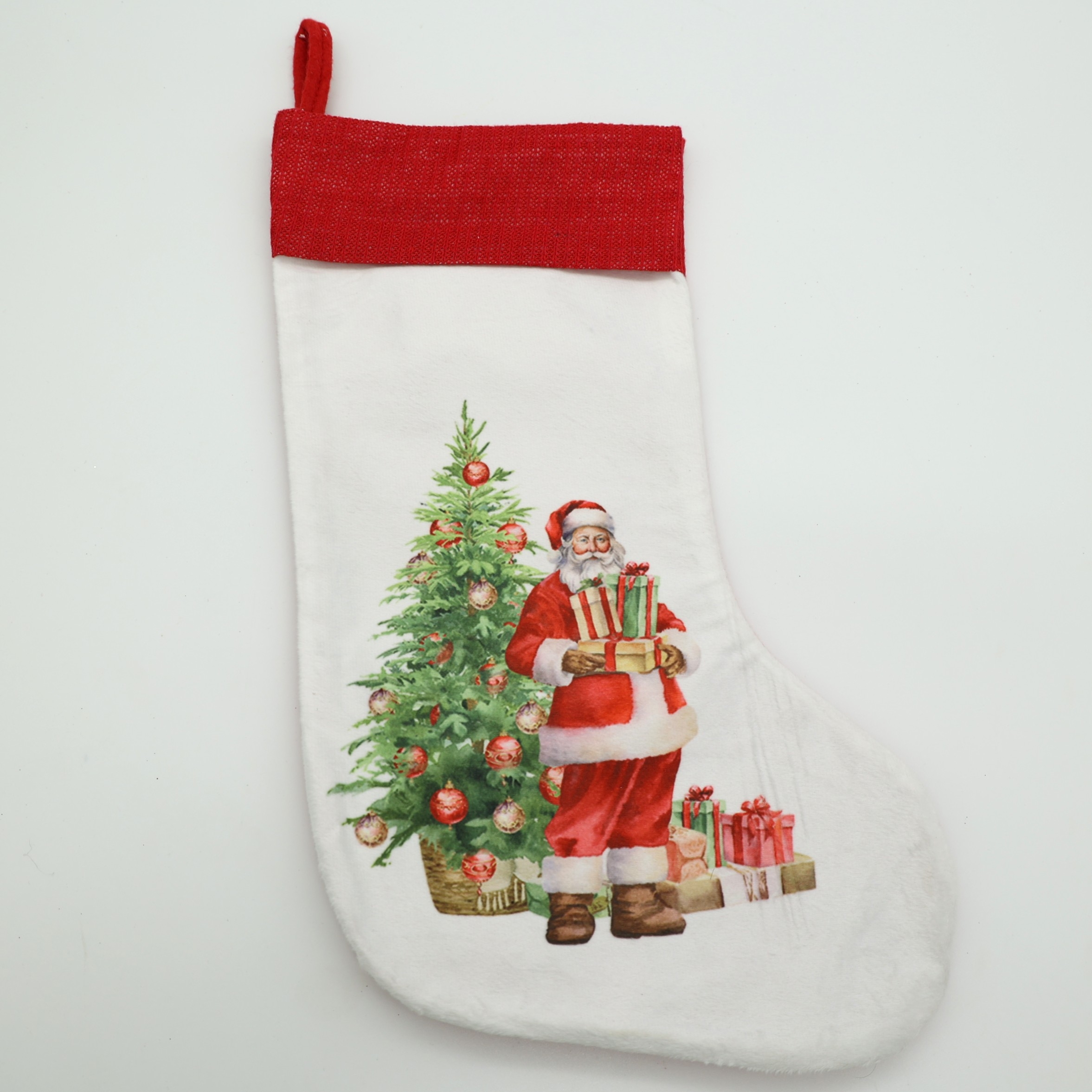 Κλασική χριστουγεννιάτικη κάλτσα διακόσμησης σε λευκό και κόκκινο χρώμα, με χαριτωμένη απεικόνιση του Άγιου Βασίλη δίπλα σε στολισμένο χριστουγεννιάτικο δέντρο και δώρα. Ο παραδοσιακός σχεδιασμός της προσθέτει ζεστασιά και γιορτινή ατμόσφαιρα στον χώρο.