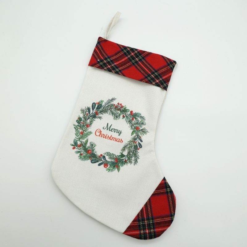 Κομψή χριστουγεννιάτικη κάλτσα διακόσμησης σε φυσικό μπεζ χρώμα, διακοσμημένη με όμορφο στεφάνι από έλατο και το μήνυμα “Merry Christmas”. Οι λεπτομέρειες σε κόκκινο καρό ύφασμα στο επάνω και κάτω μέρος χαρίζουν παραδοσιακό και ζεστό χαρακτήρα.